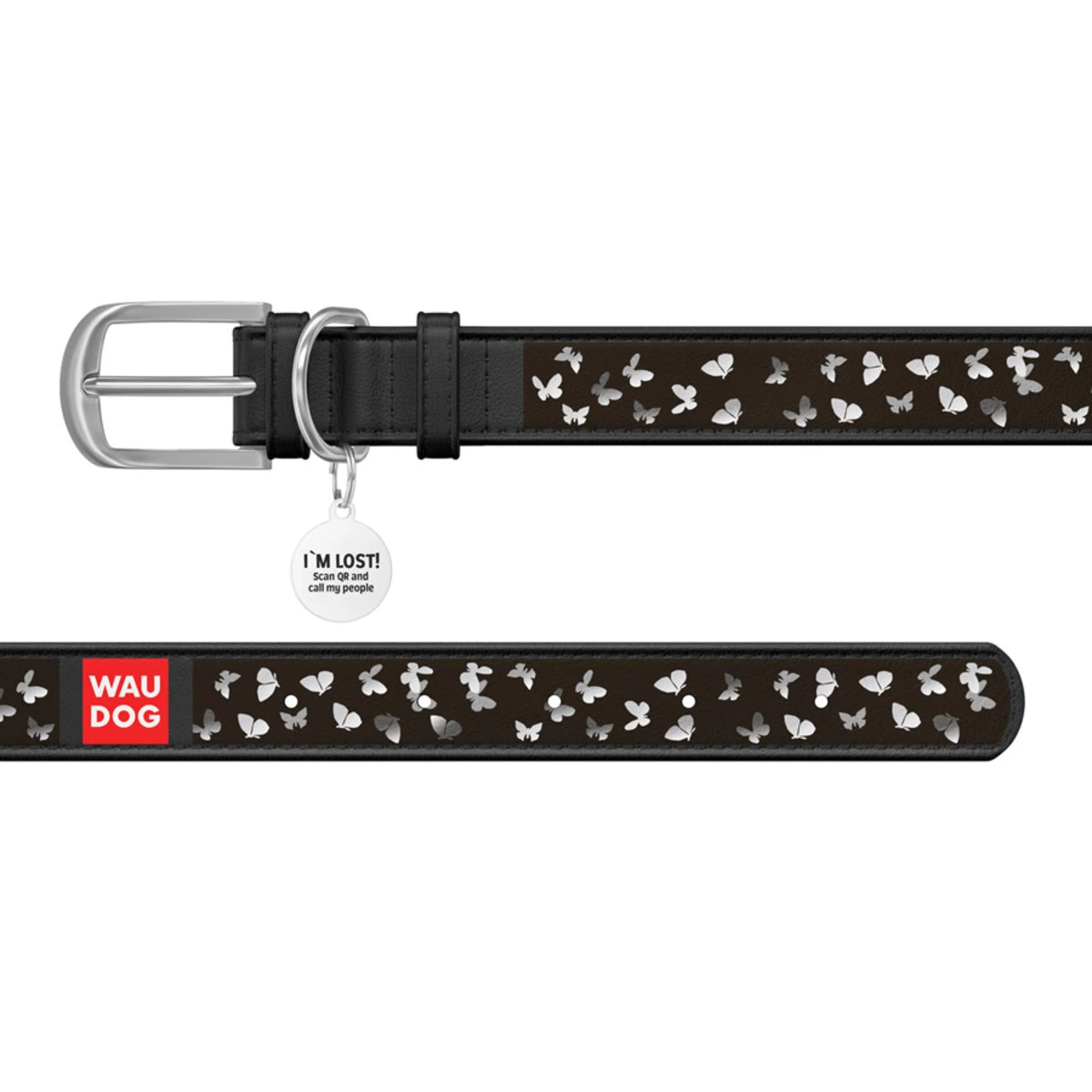 Ошейник WAUDOG Design с рисунком "Бабочки", премиум кожа, металлическая пряжка (ширина 12 мм, длина 19-25 см), черный
