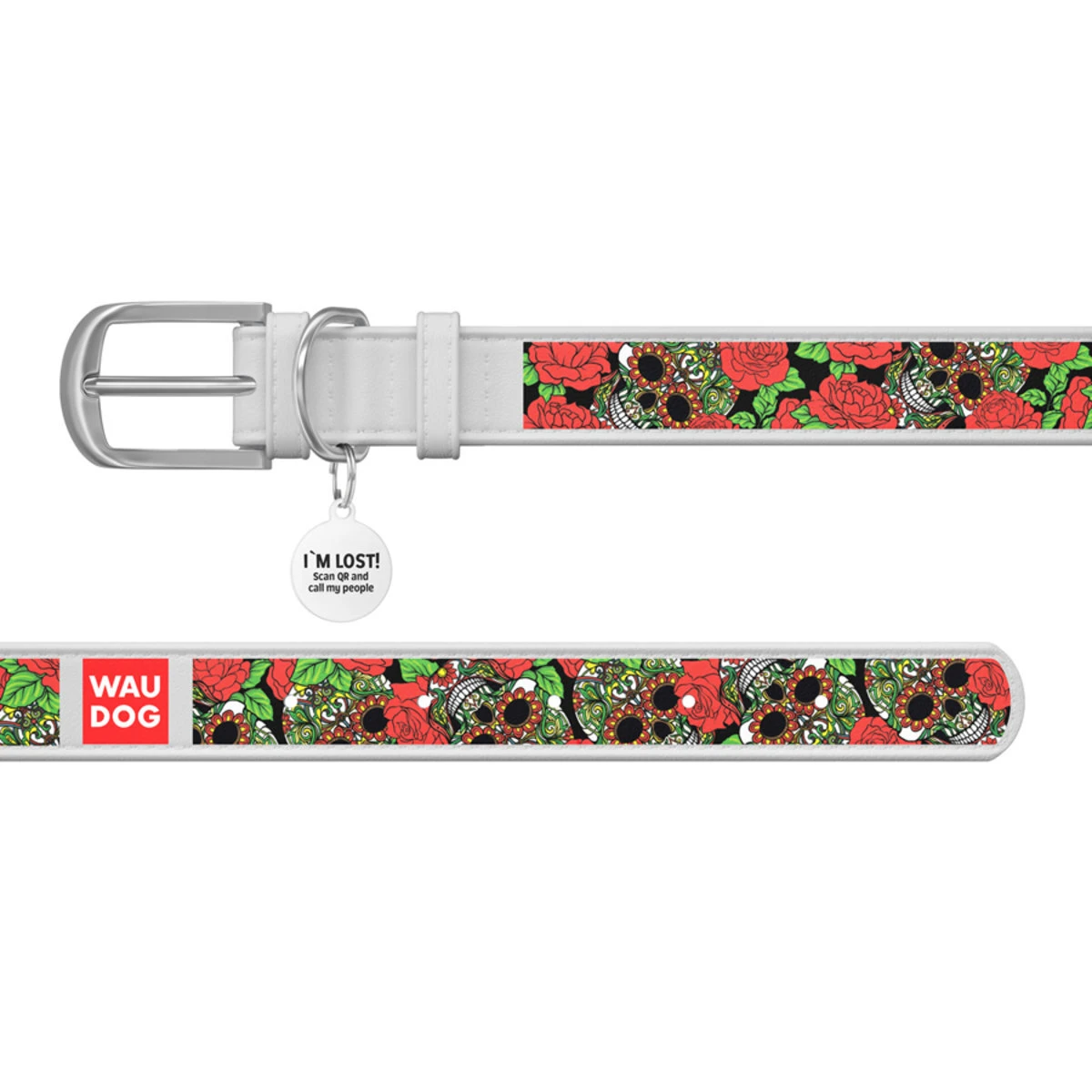Ошейник WAUDOG Design с рисунком "Черепа и розы", премиум кожа, металлическая пряжка (ширина 15 мм, длина 27-36 см), белый