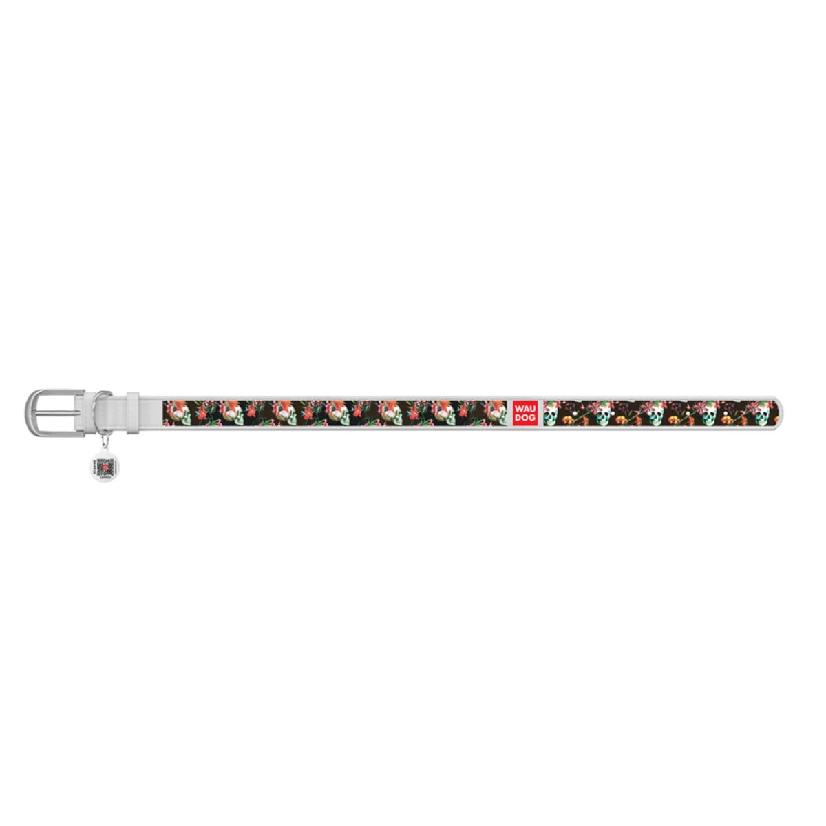 Ошейник WAUDOG Design с рисунком "Черепа", премиум кожа, металлическая пряжка (ширина 12 мм, длина 19-25 см), белый
