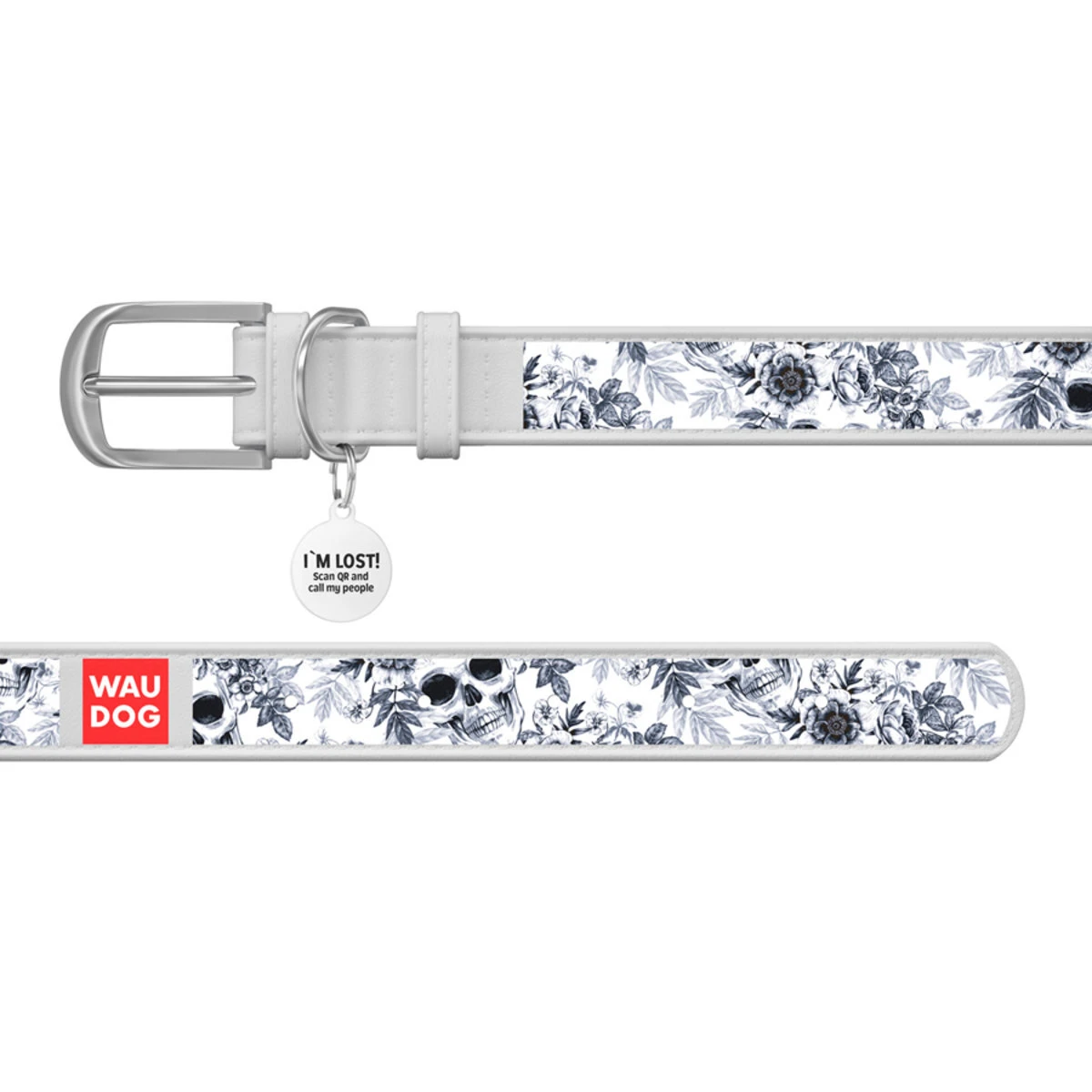Ошейник WAUDOG Design с рисунком "Черно-белые черепа", премиум кожа, металлическая пряжка (ширина 12 мм, длина 21-29 см), белый