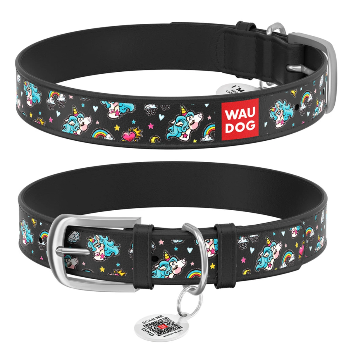 Ошейник WAUDOG Design с рисунком "Единороги", премиум кожа, металлическая пряжка (ширина 20 мм, длина 30-39 см), черный