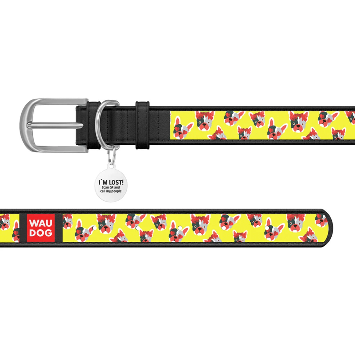 Ошейник WAUDOG Design с рисунком "Француз", премиум кожа, металлическая пряжка (ширина 35 мм, длина 46-60 см), черный