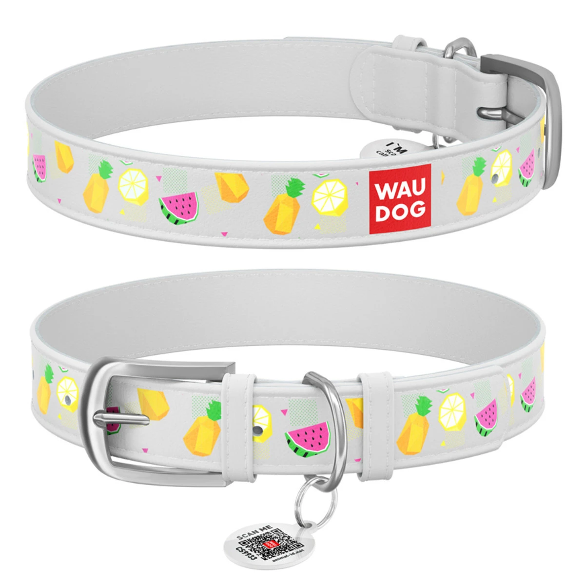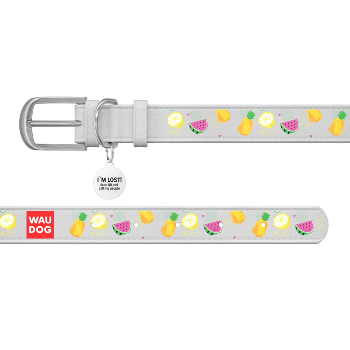 Ошейник WAUDOG Design с рисунком "Фрукты", премиум кожа, металлическая пряжка (ширина 20 мм, длина 30-39 см), белый