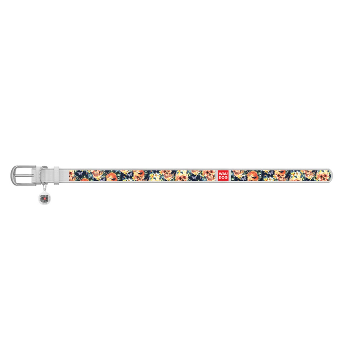 Ошейник WAUDOG Design с рисунком "Гламурные черепа", премиум кожа, металлическая пряжка (ширина 25 мм, длина 38-49 см), белый