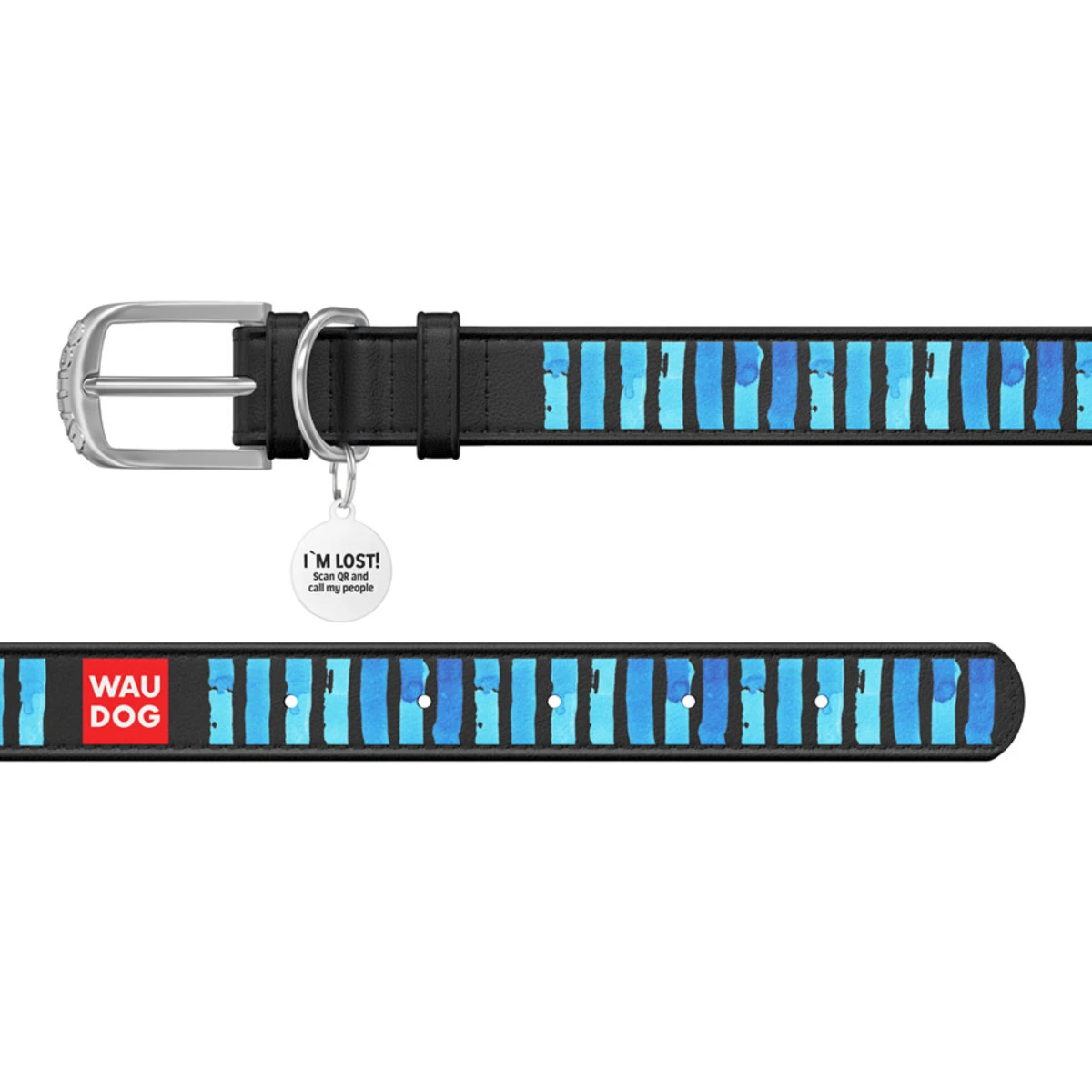 Ошейник WAUDOG Design с рисунком "Голубые полоски", премиум кожа, металлическая пряжка (ширина 20 мм, длина 30-39 см), черный