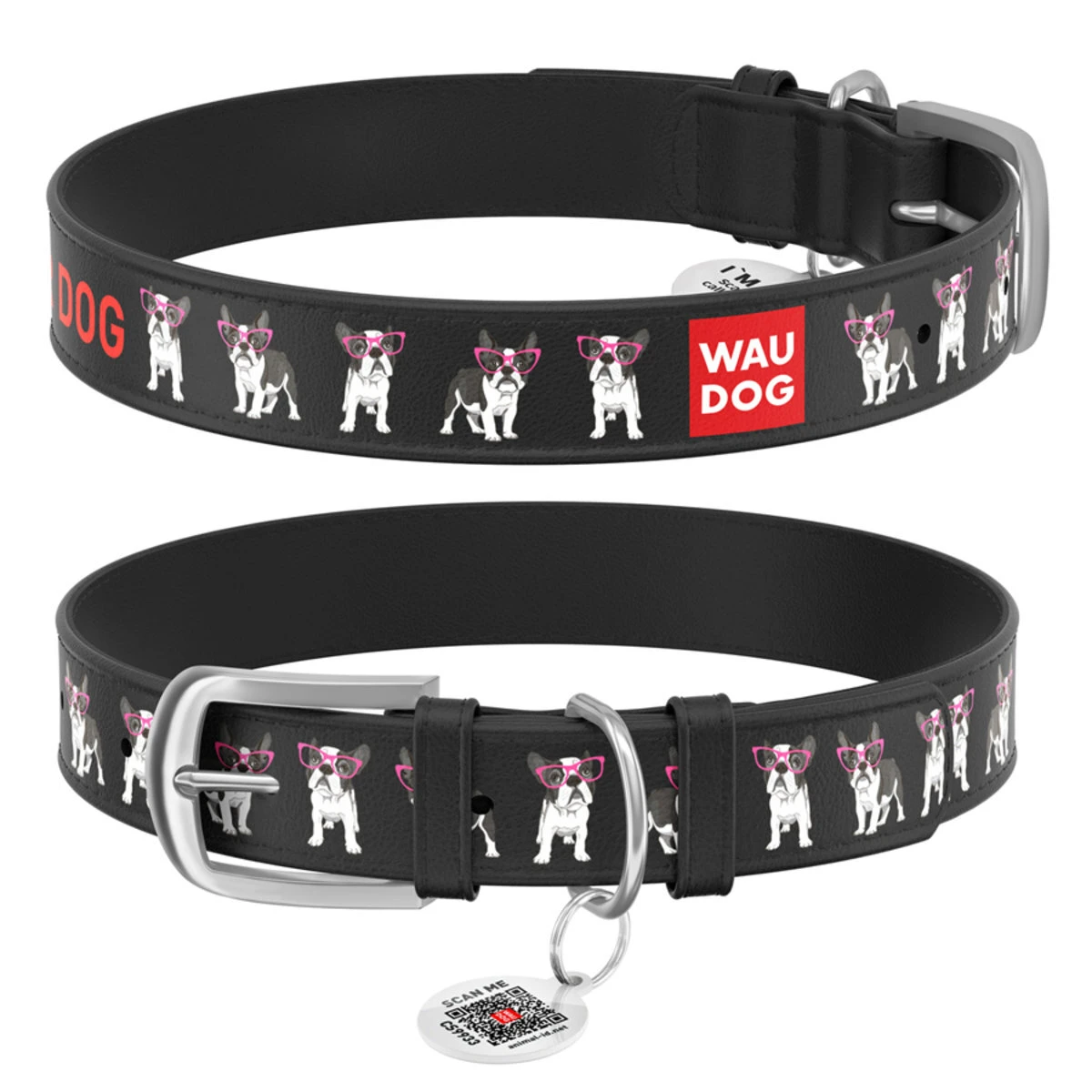Ошейник WAUDOG Design с рисунком "Хипстер", премиум кожа, металлическая пряжка (ширина 35 мм, длина 46-60 см), черный
