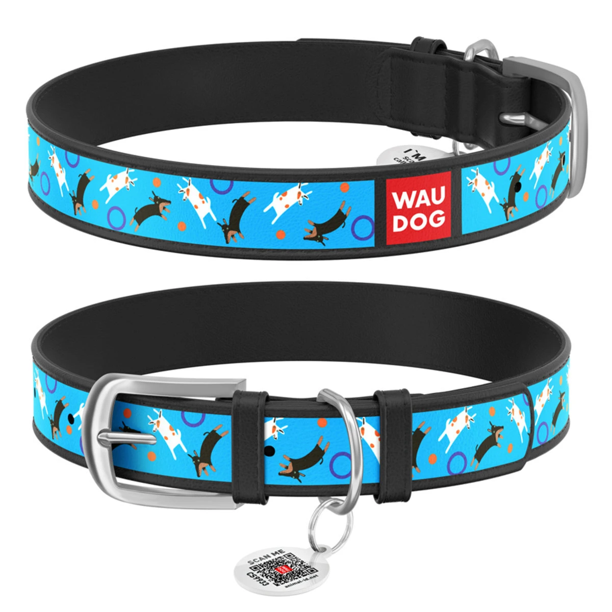 Ошейник WAUDOG Design с рисунком "Игривые собачки", премиум кожа, металлическая пряжка (ширина 25 мм, длина 38-49 см), черный