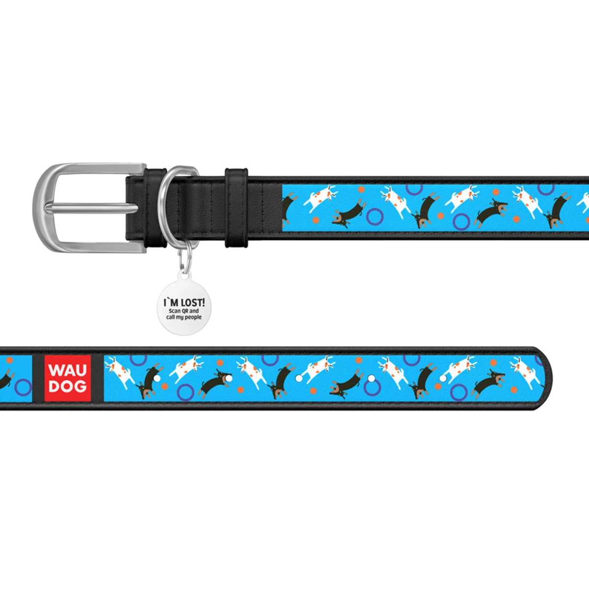 Ошейник WAUDOG Design с рисунком "Игривые собачки", премиум кожа, металлическая пряжка (ширина 35 мм, длина 46-60 см), черный