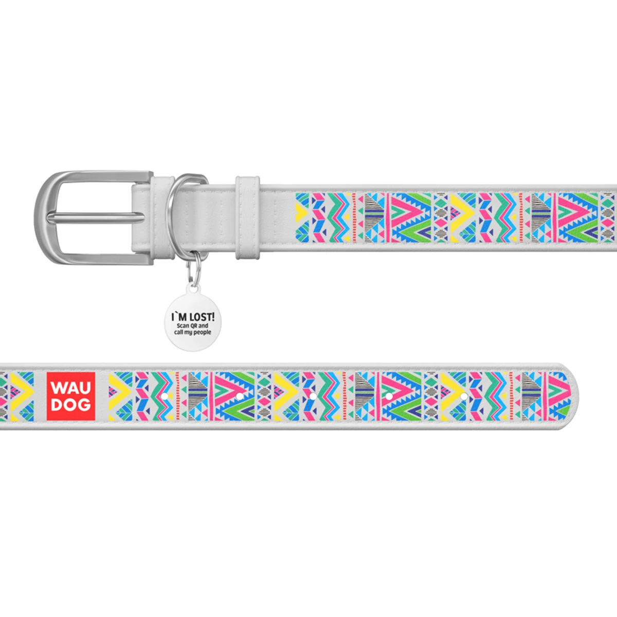 Ошейник WAUDOG Design с рисунком "Инди", премиум кожа, металлическая пряжка (ширина 15 мм, длина 27-36 см), белый