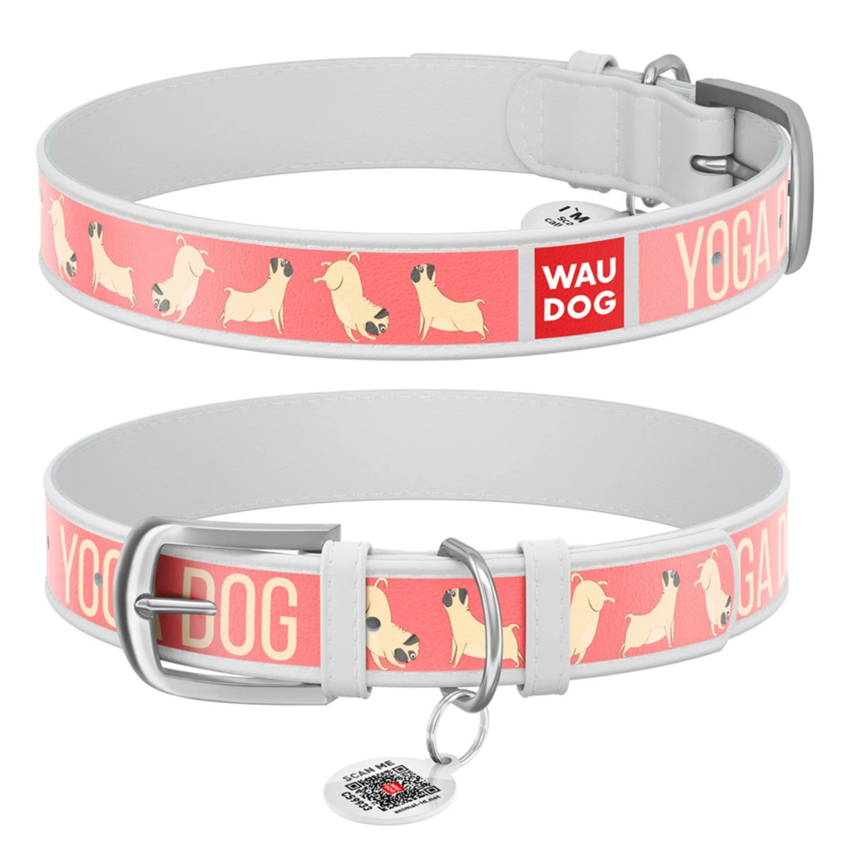 Ошейник WAUDOG Design с рисунком "Йога-пёс", премиум кожа, металлическая пряжка (ширина 15 мм, длина 27-36 см), белый