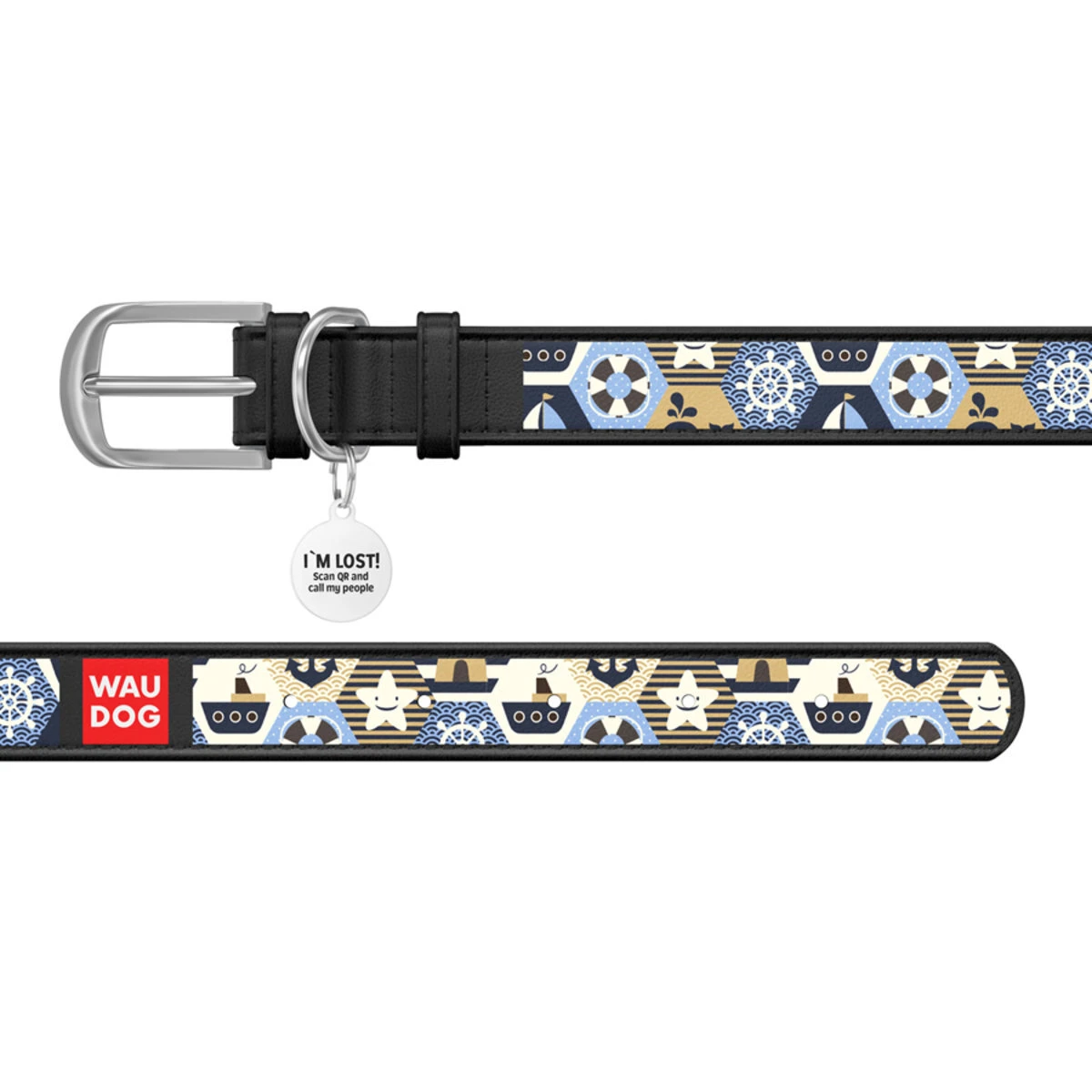 Ошейник WAUDOG Design с рисунком "Капитан", премиум кожа, металлическая пряжка (ширина 35 мм, длина 46-60 см), черный