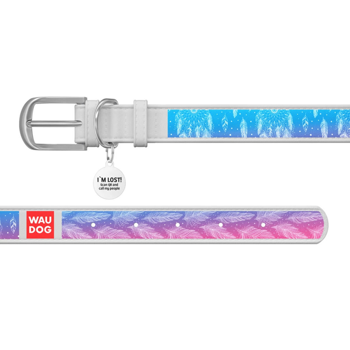 Ошейник WAUDOG Design с рисунком "Ловец снов", премиум кожа, металлическая пряжка (ширина 35 мм, длина 46-60 см), белый