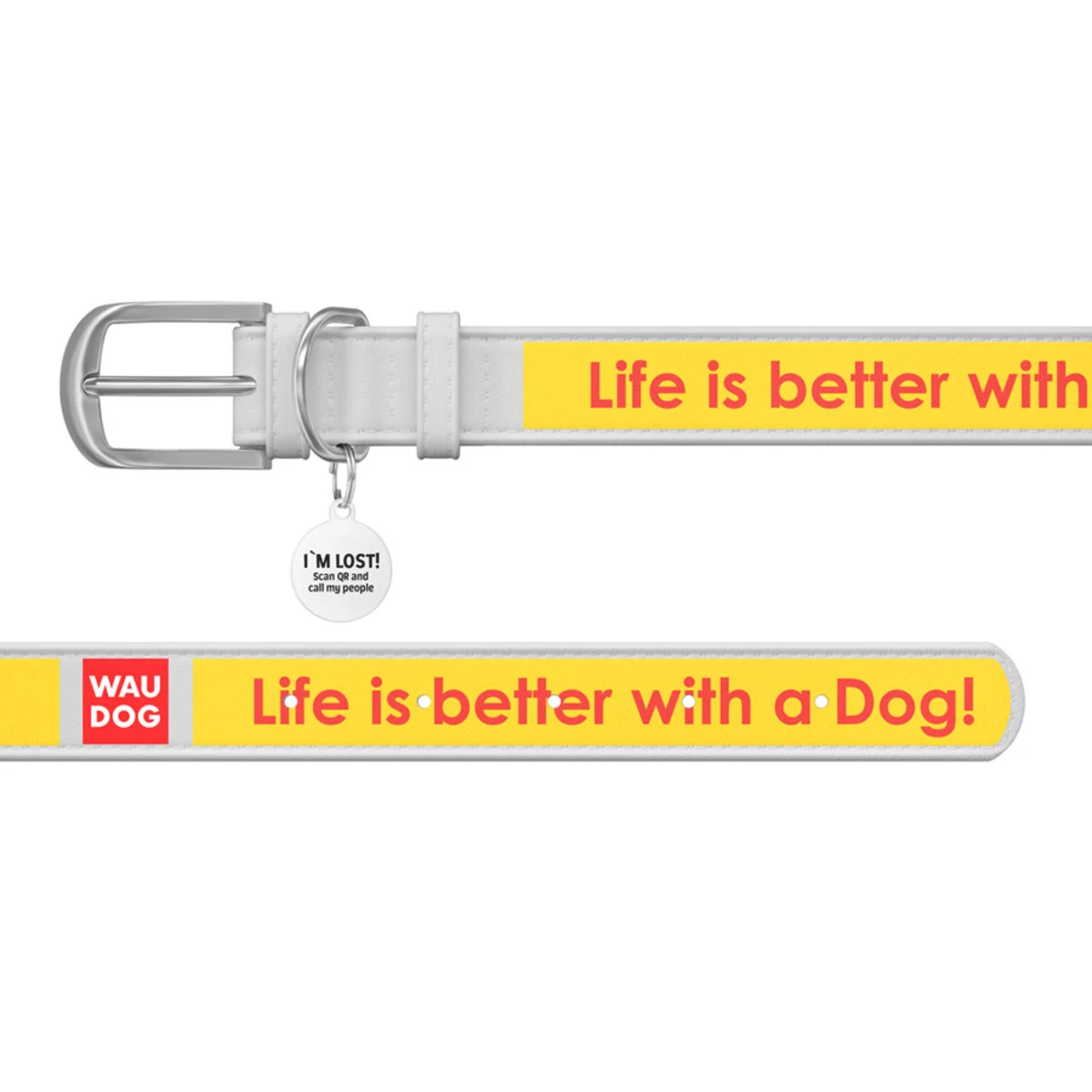 Ошейник WAUDOG Design с рисунком "Лучшая жизнь", премиум кожа, металлическая пряжка (ширина 12 мм, длина 21-29 см), белый