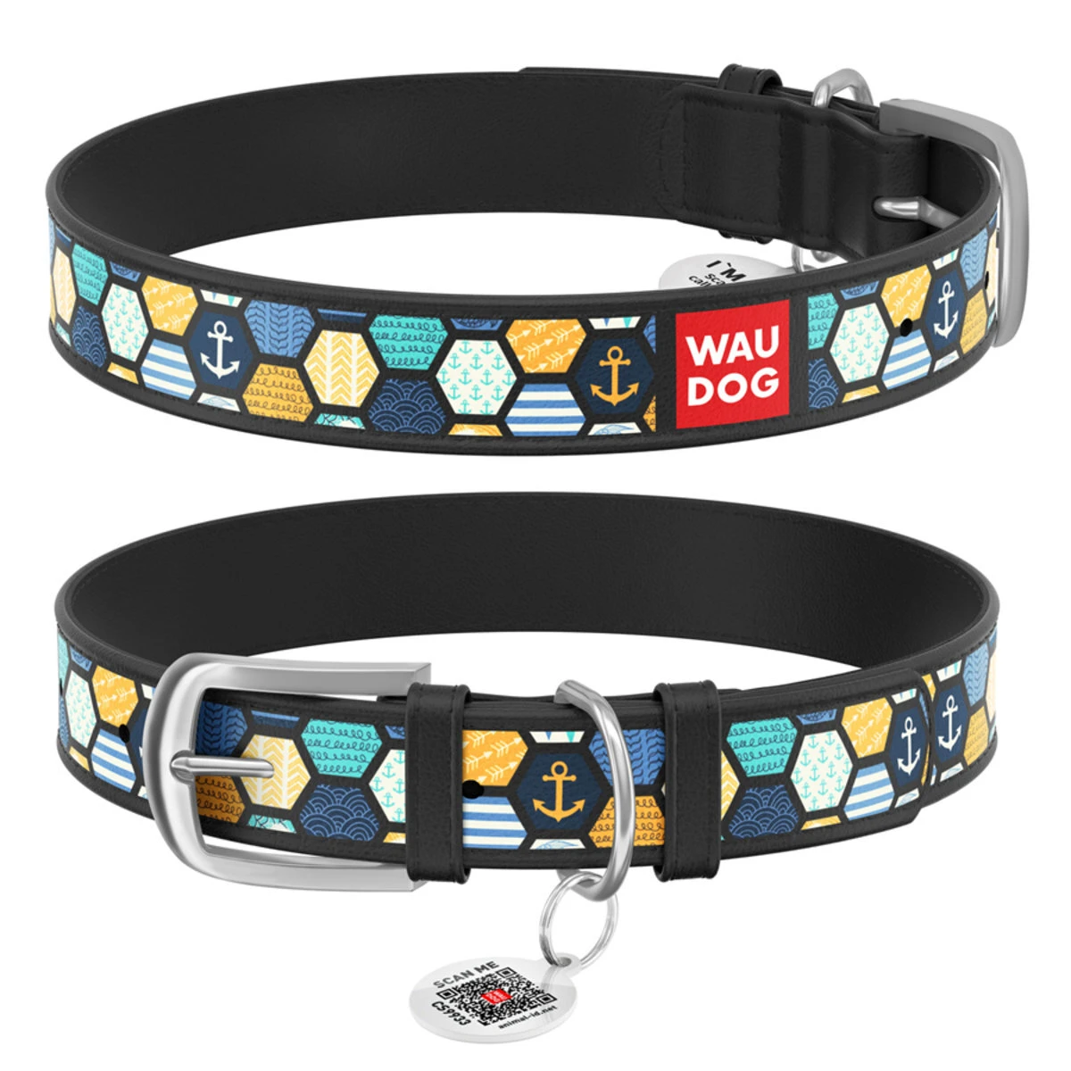 Ошейник WAUDOG Design с рисунком "Морской 2", премиум кожа, металлическая пряжка (ширина 25 мм, длина 38-49 см), черный