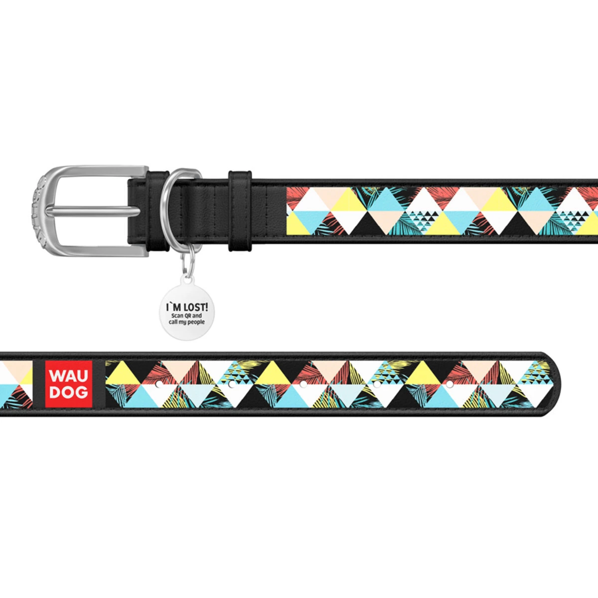 Ошейник WAUDOG Design с рисунком "Пэчворк", премиум кожа, металлическая пряжка (ширина 20 мм, длина 30-39 см), черный