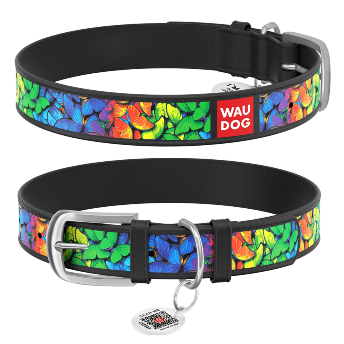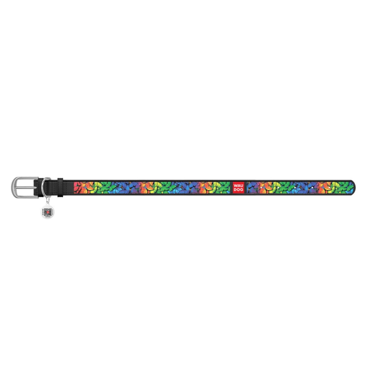 Ошейник WAUDOG Design с рисунком "Радужные бабочки", премиум кожа, металлическая пряжка (ширина 12 мм, длина 19-25 см), черный