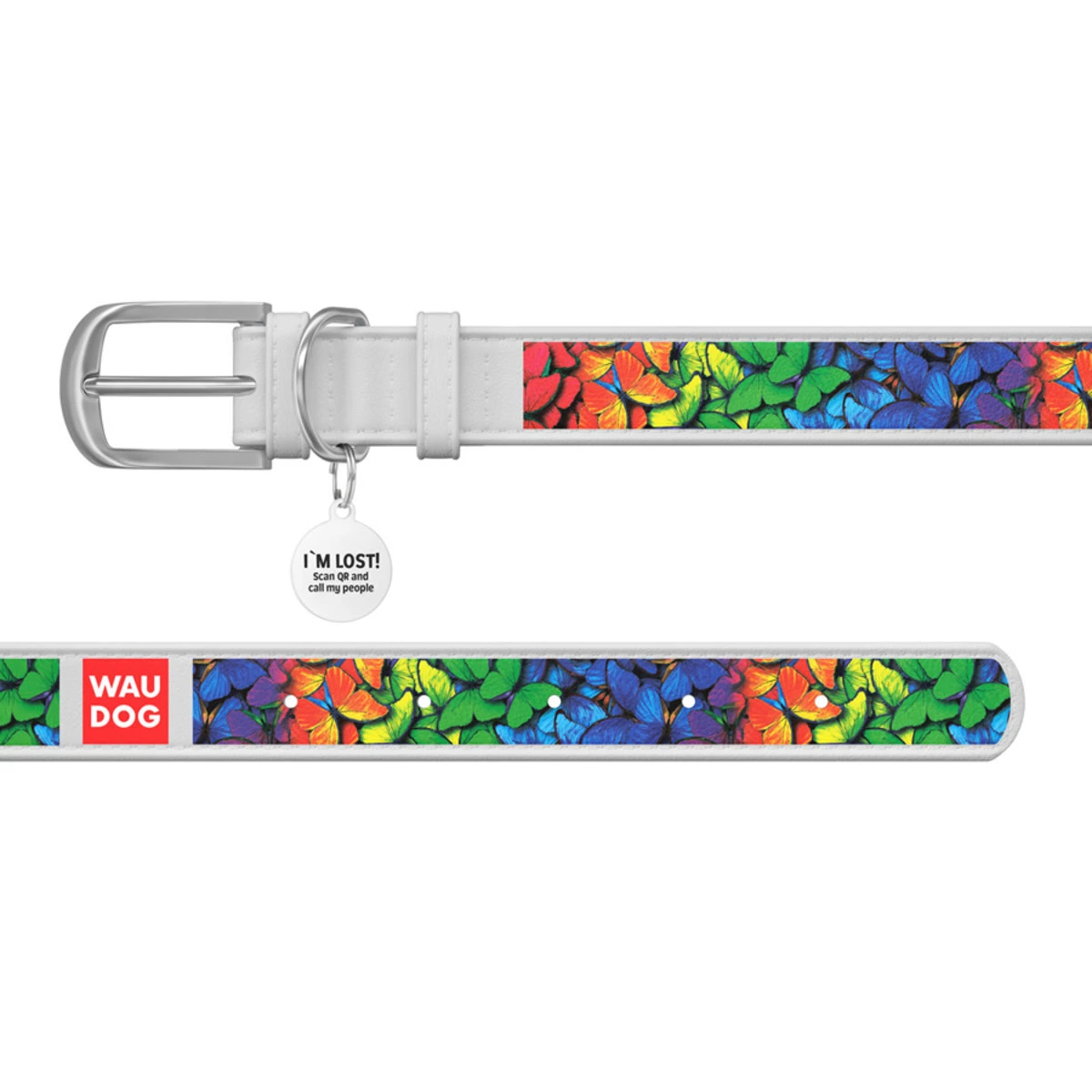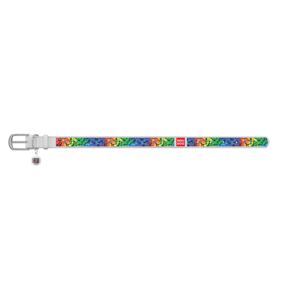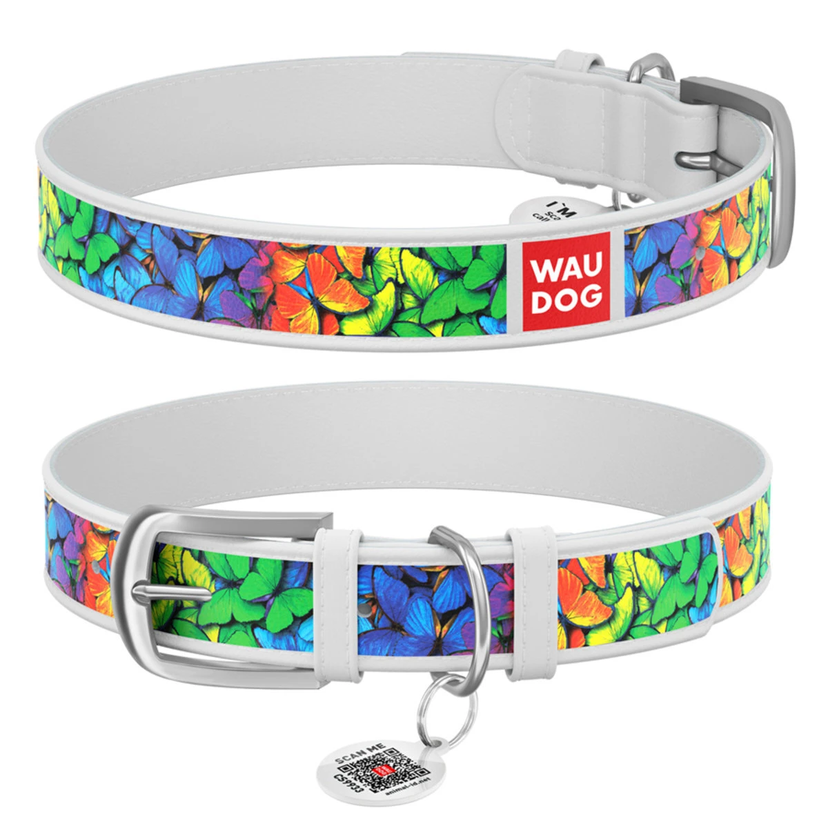 Ошейник WAUDOG Design с рисунком "Радужные бабочки", премиум кожа, металлическая пряжка (ширина 20 мм, длина 30-39 см), белый