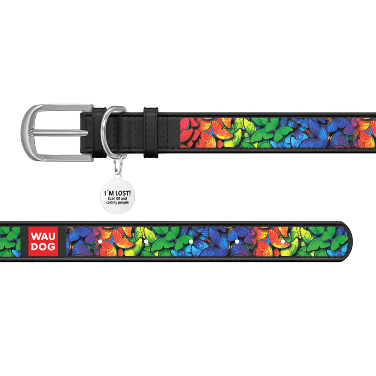 Ошейник WAUDOG Design с рисунком "Радужные бабочки", премиум кожа, металлическая пряжка (ширина 35 мм, длина 46-60 см), черный
