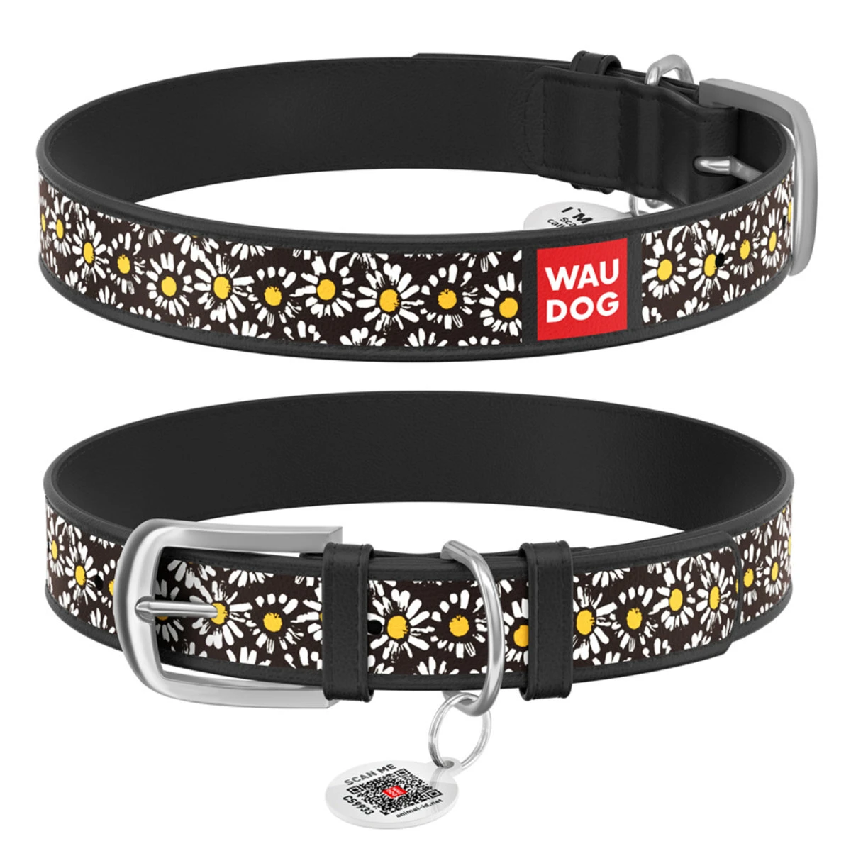 Ошейник WAUDOG Design с рисунком "Ромашки", премиум кожа, металлическая пряжка (ширина 25 мм, длина 38-49 см), черный