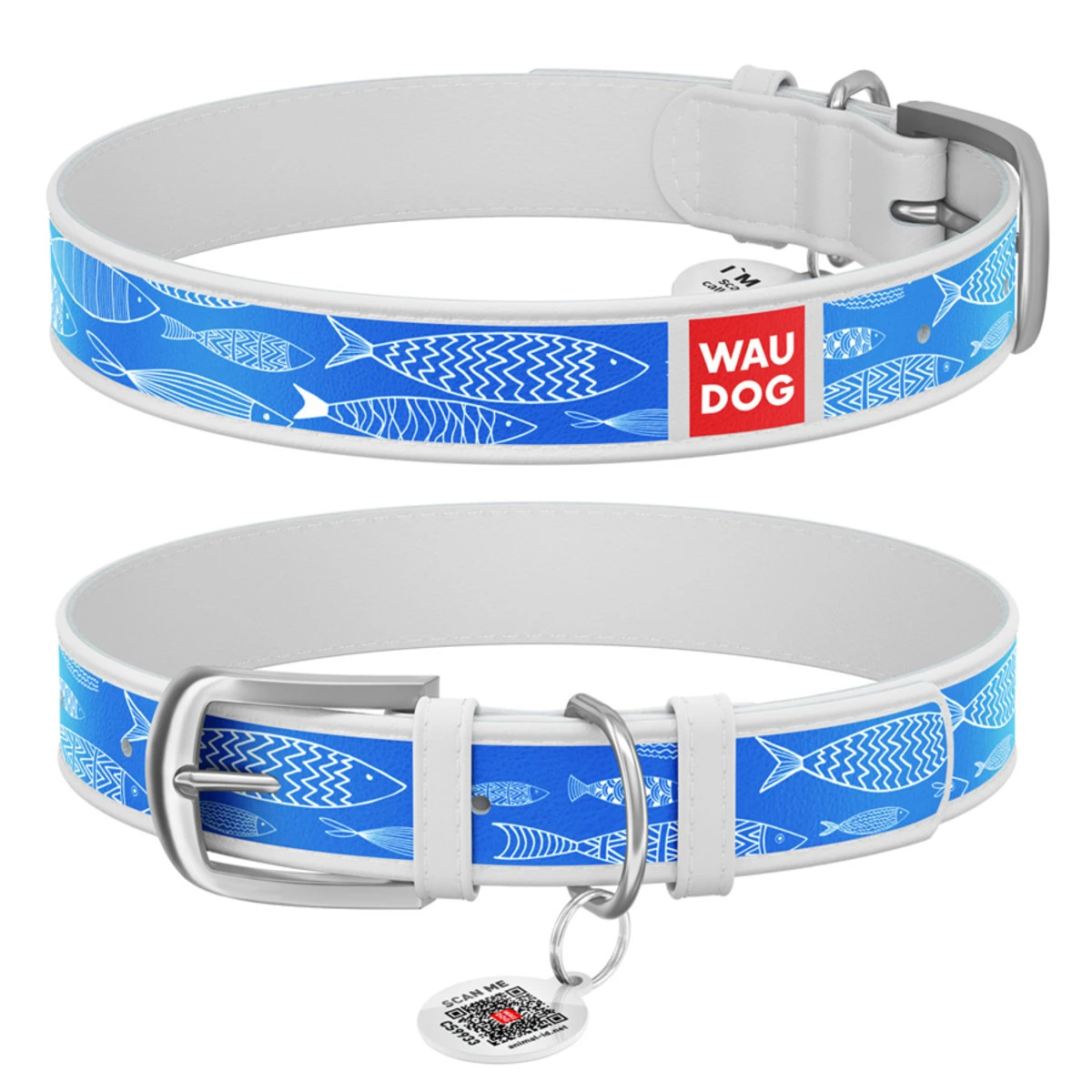 Ошейник WAUDOG Design с рисунком "Рыба", премиум кожа, металлическая пряжка (ширина 25 мм, длина 38-49 см), белый