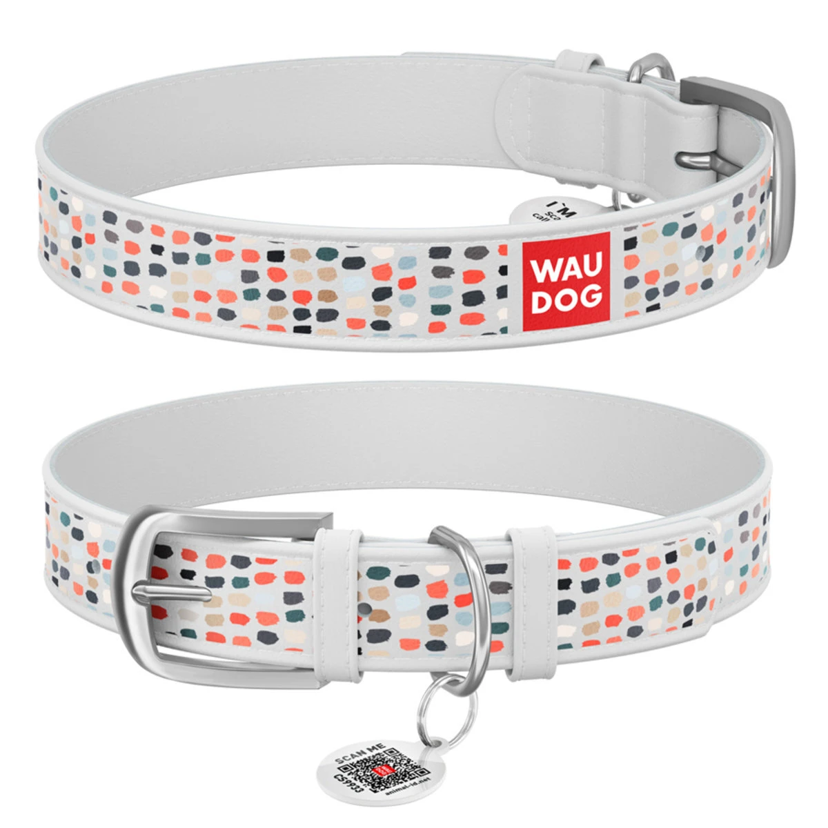 Ошейник WAUDOG Design с рисунком "Смешные точки", премиум кожа, металлическая пряжка (ширина 25 мм, длина 38-49 см), белый