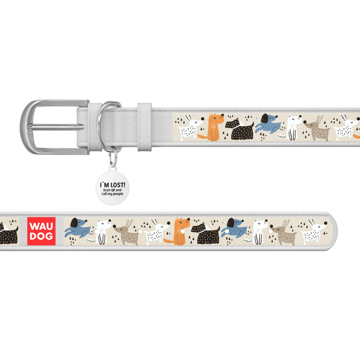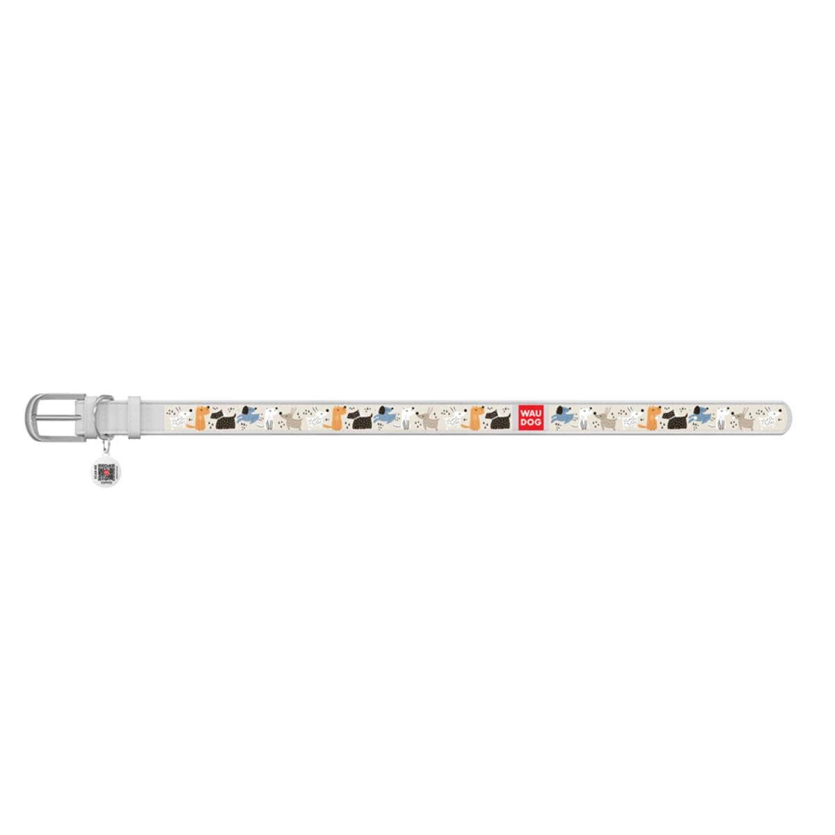 Ошейник WAUDOG Design с рисунком "Собачки на прогулке", премиум кожа, металлическая пряжка (ширина 15 мм, длина 27-36 см), белый