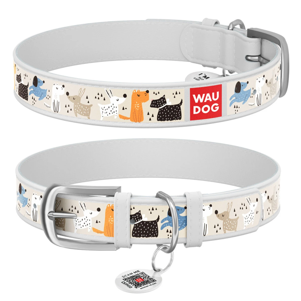 Ошейник WAUDOG Design с рисунком "Собачки на прогулке", премиум кожа, металлическая пряжка (ширина 35 мм, длина 46-60 см), белый