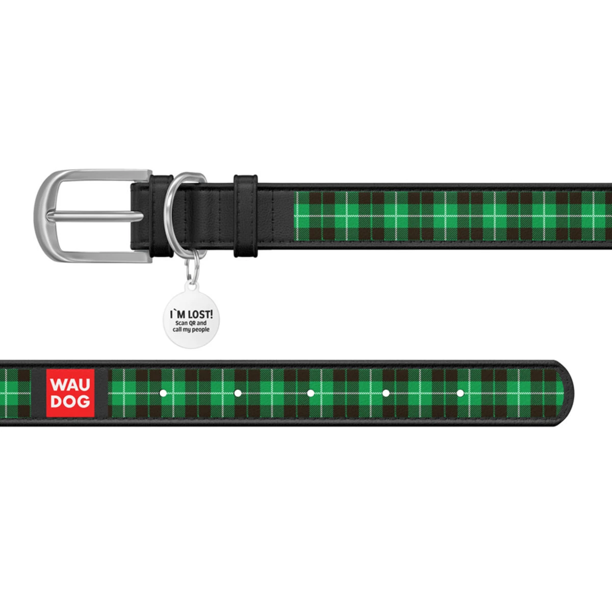 Ошейник WAUDOG Design с рисунком "Шотландка зеленая", премиум кожа, металлическая пряжка (ширина 35 мм, длина 46-60 см), черный