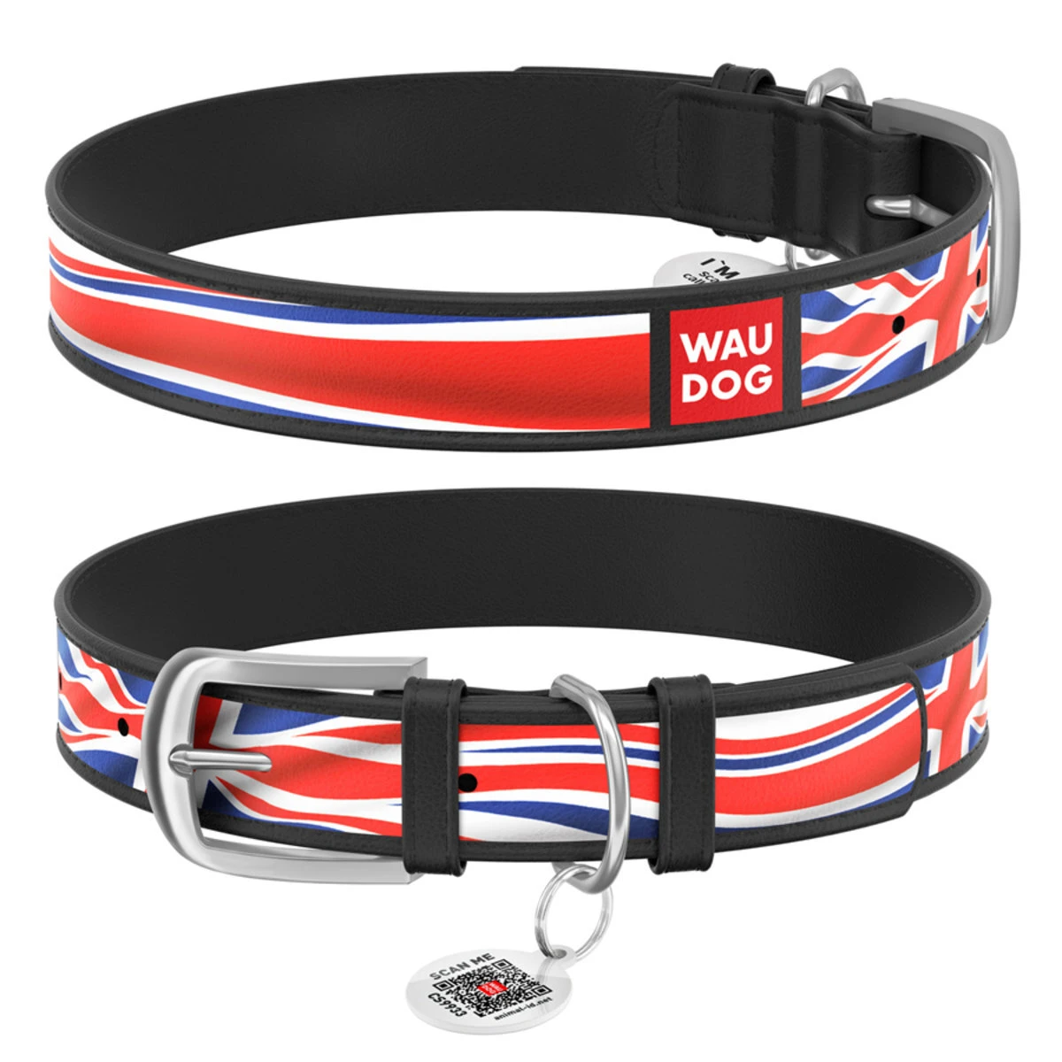 Ошейник WAUDOG Design с рисунком "Юнион Джек", премиум кожа, металлическая пряжка (ширина 20 мм, длина 30-39 см), черный