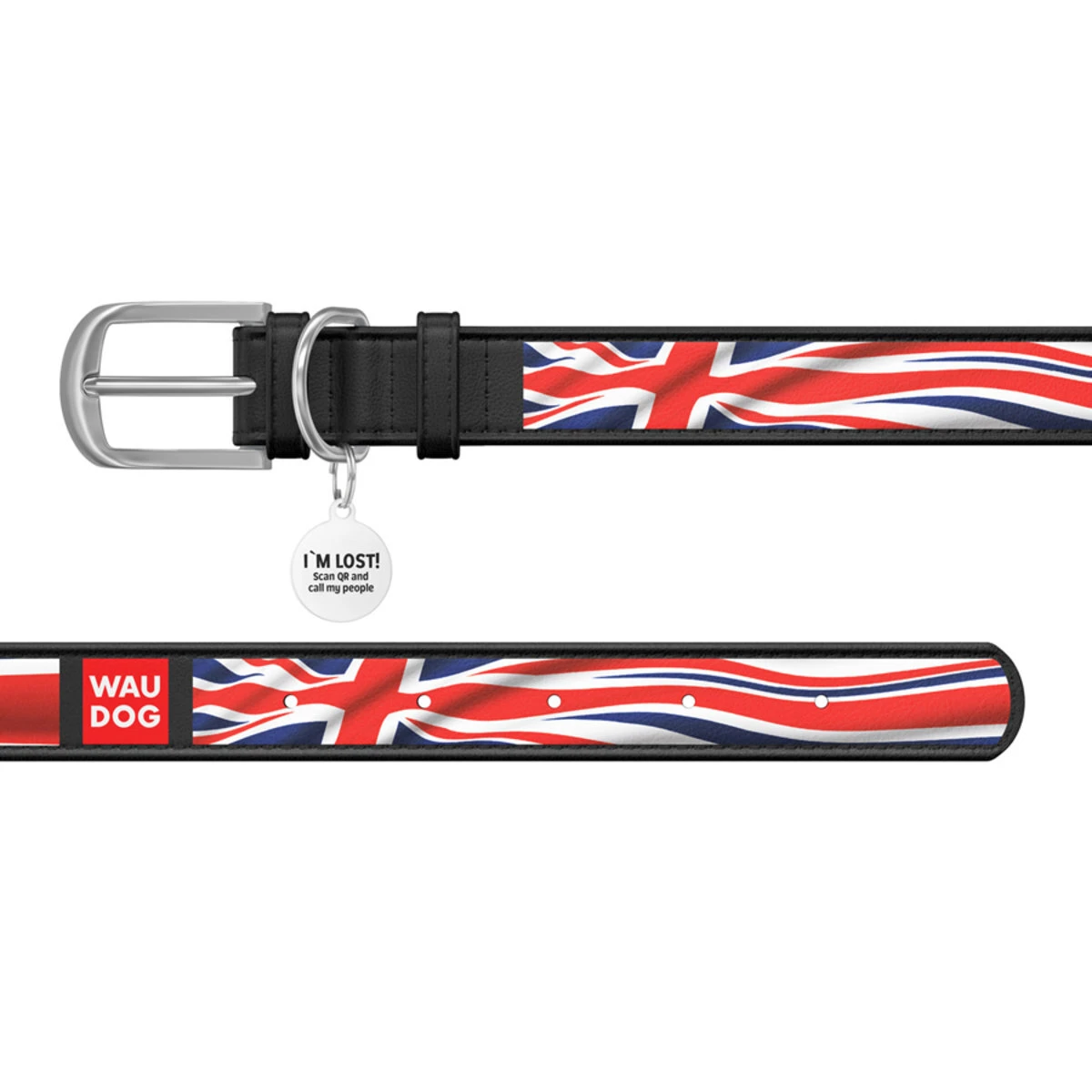Ошейник WAUDOG Design с рисунком "Юнион Джек", премиум кожа, металлическая пряжка (ширина 25 мм, длина 38-49 см), черный
