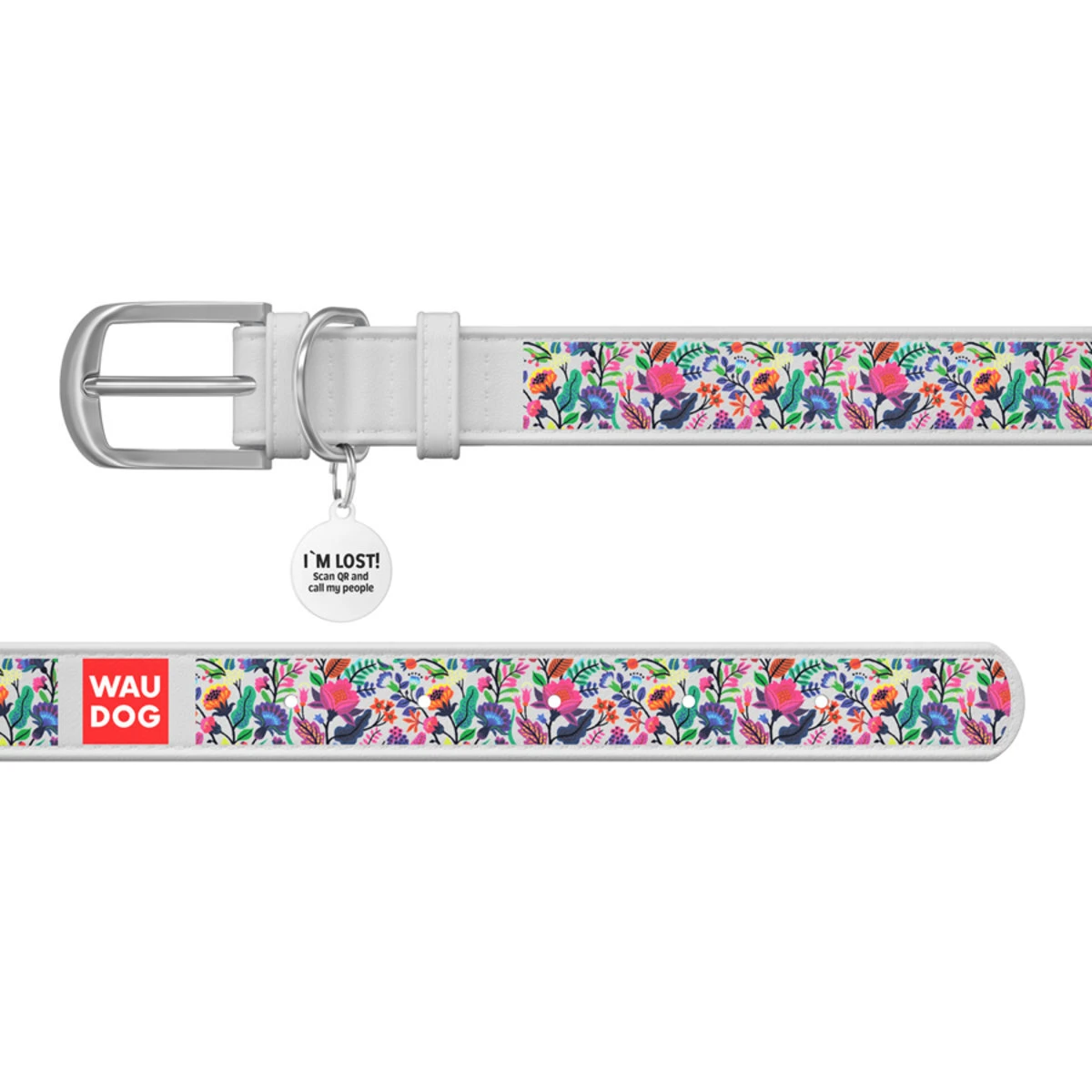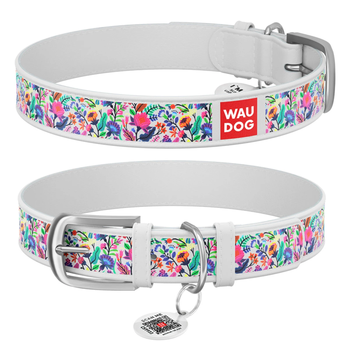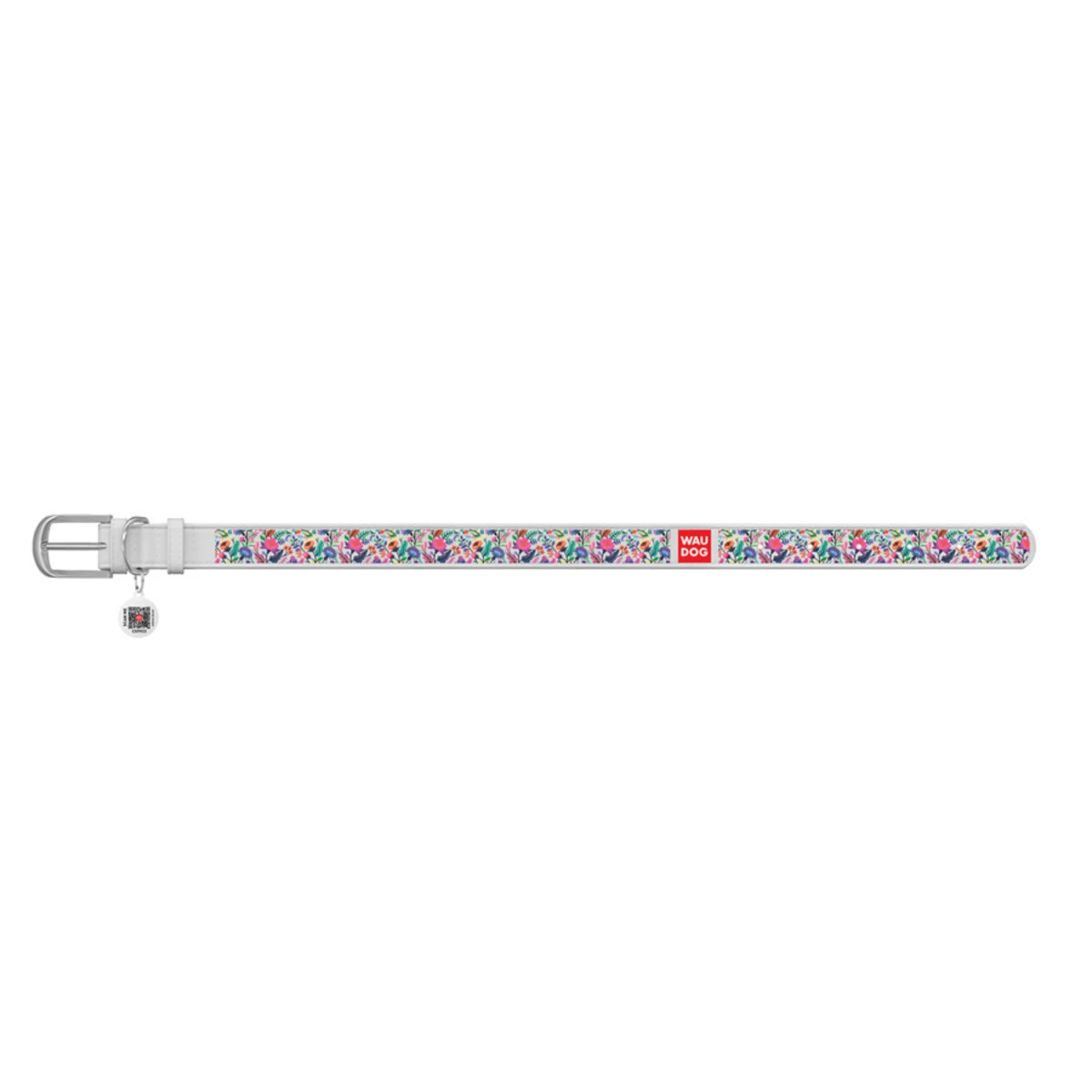 Ошейник WAUDOG Design с рисунком "Волшебные цветы", премиум кожа, металлическая пряжка (ширина 12 мм, длина 21-29 см), белый