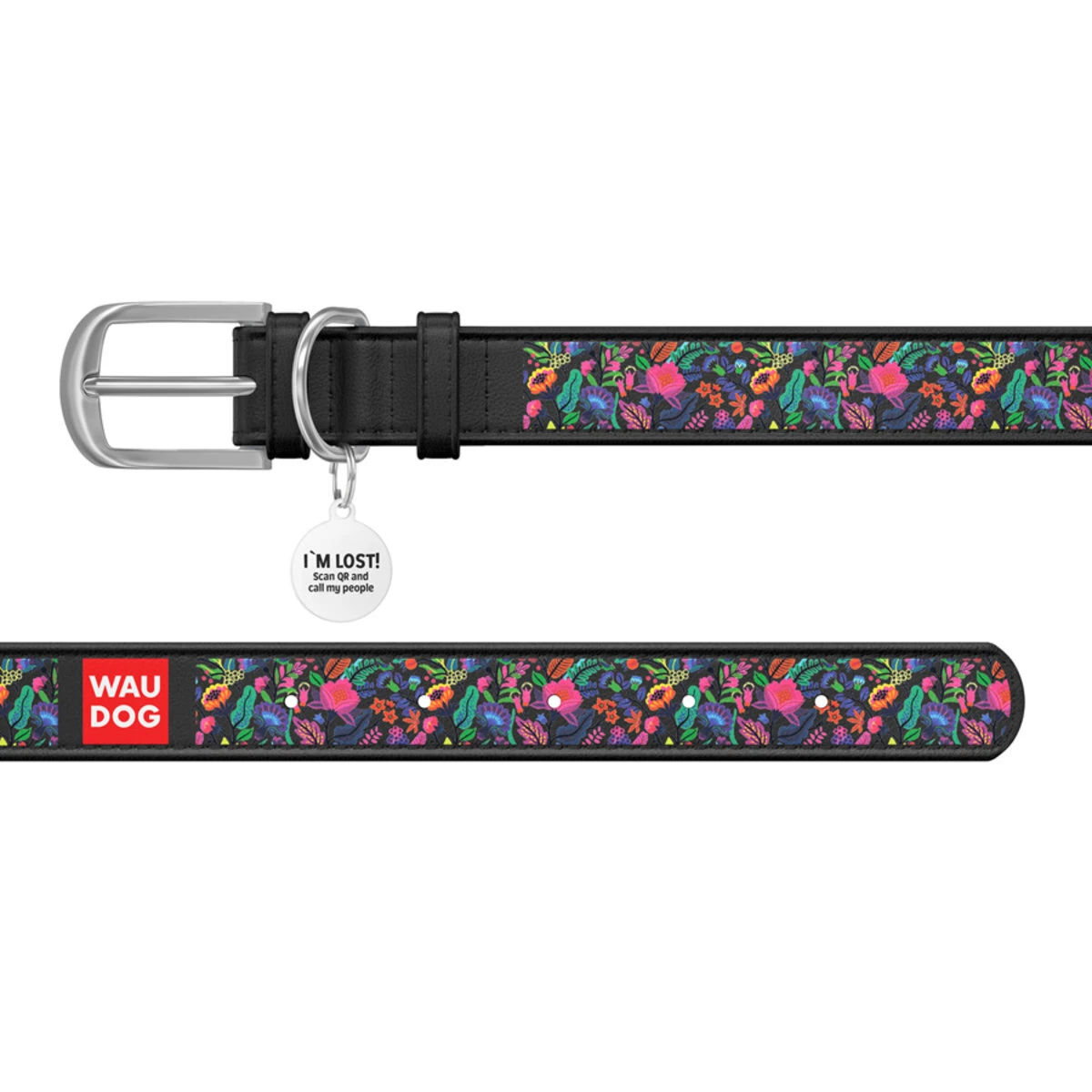 Ошейник WAUDOG Design с рисунком "Волшебные цветы", премиум кожа, металлическая пряжка (ширина 12 мм, длина 21-29 см), черный