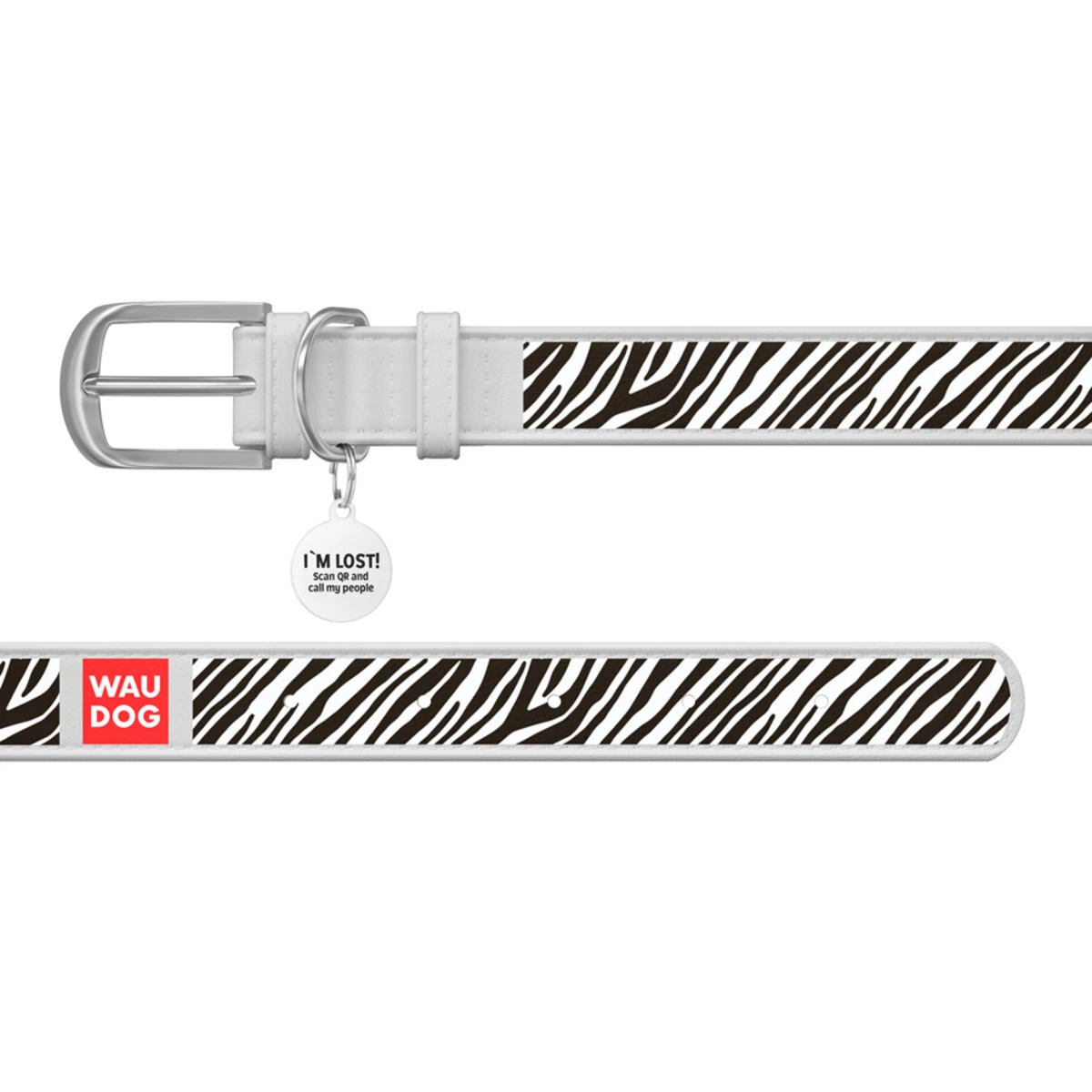 Ошейник WAUDOG Design с рисунком "Зебра", премиум кожа, металлическая пряжка (ширина 35 мм, длина 46-60 см), белый