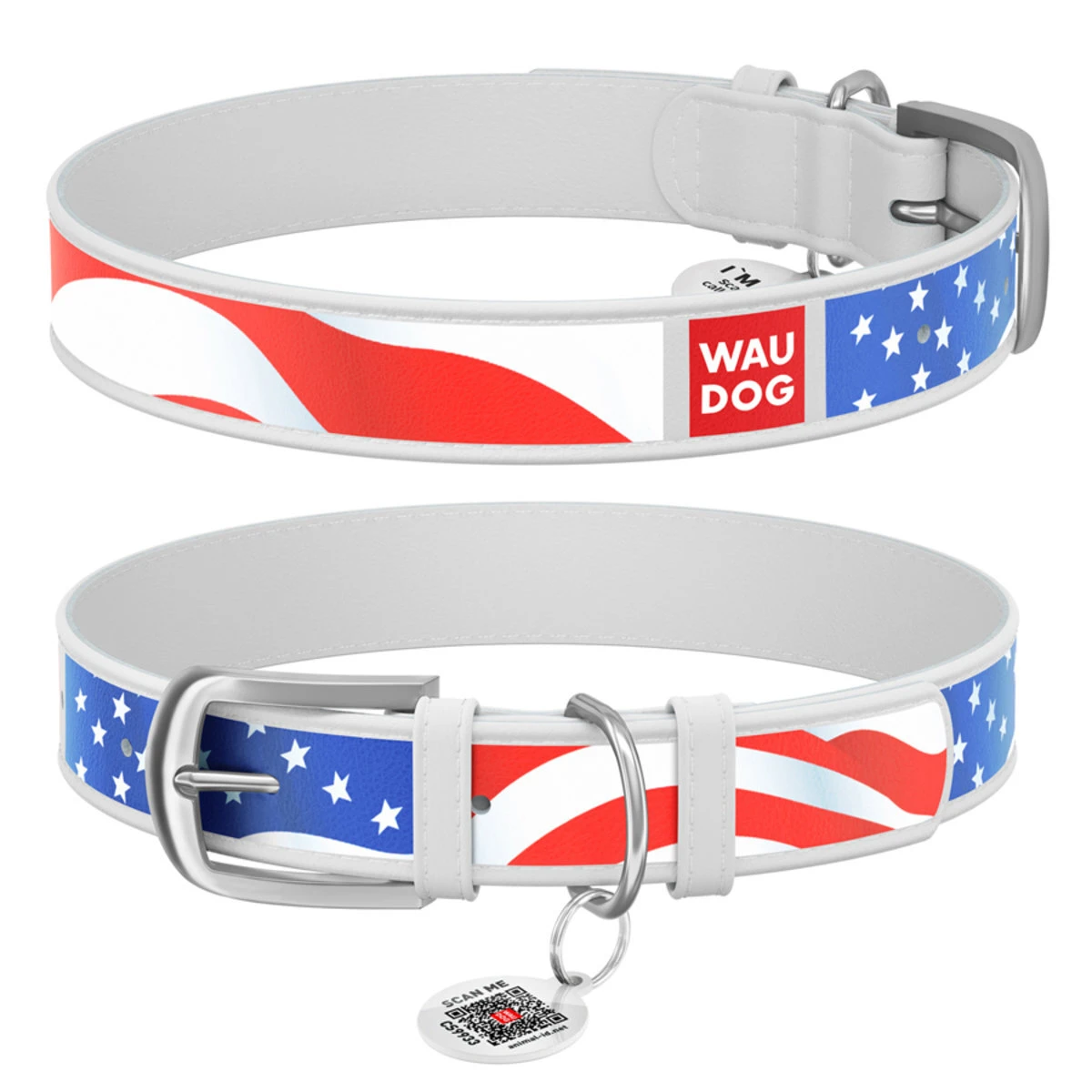 Ошейник WAUDOG Design с рисунком "Звёзды и полосы", премиум кожа, металлическая пряжка (ширина 12 мм, длина 19-25 см), белый