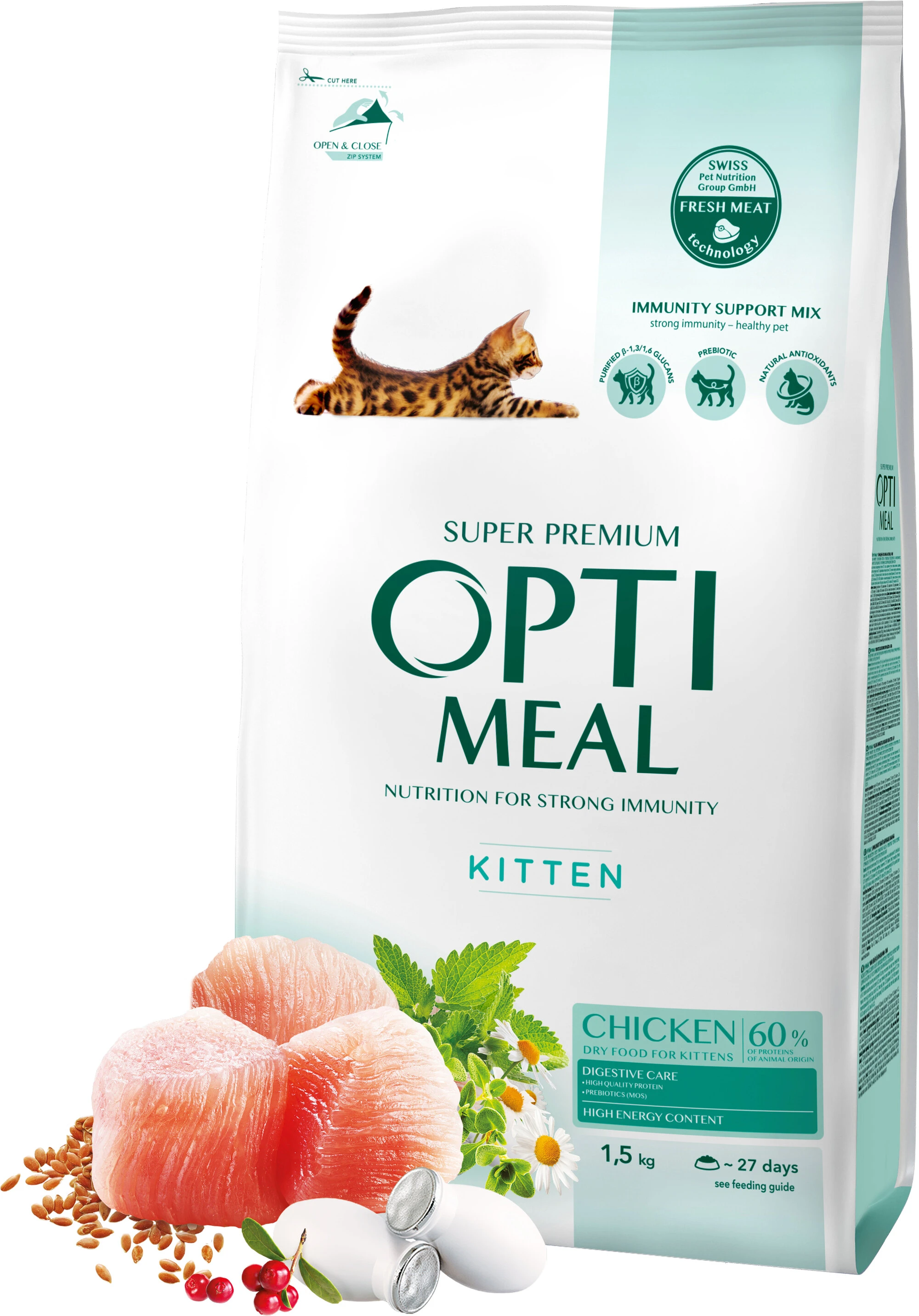 Полнорационный сухой корм для котят Optimeal – курица 1.5 кг. Укрепляет иммунитет. Легкоусвояемый белок и пребиотики способствуют пищеварению. Оптимальное соотношение Ca, P и витамина D3 обеспечивает здоровый рост.