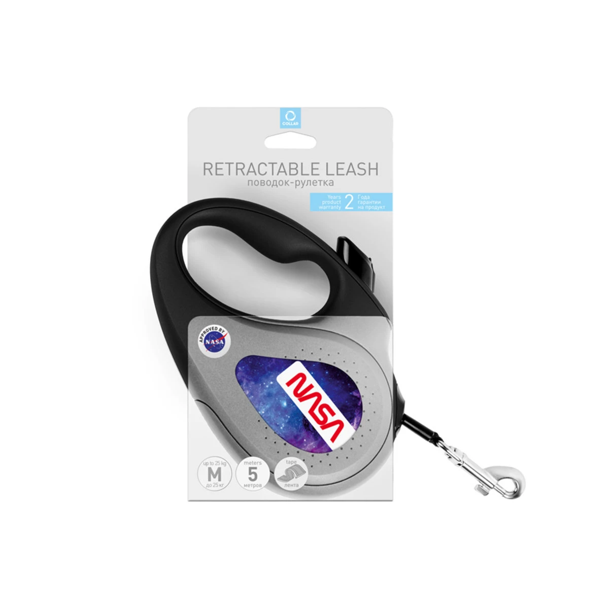 Поводок-рулетка для собак WAUDOG R-leash, рисунок "NASA21", M, до 25 кг, 5 м, светоотражающая лента, черный