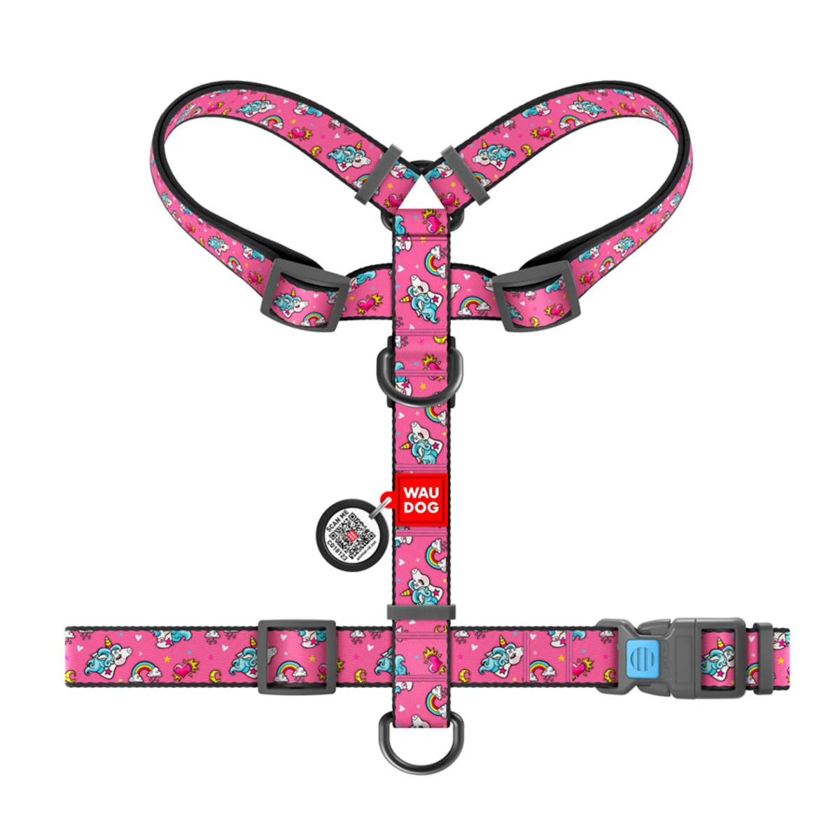 Шлея для собак анатомическая H-образная WAUDOG Nylon с QR-паспортом, рисунок "Единороги", пластиковый фастекс, S, Ш 15 мм, A 30-40, B 30-50