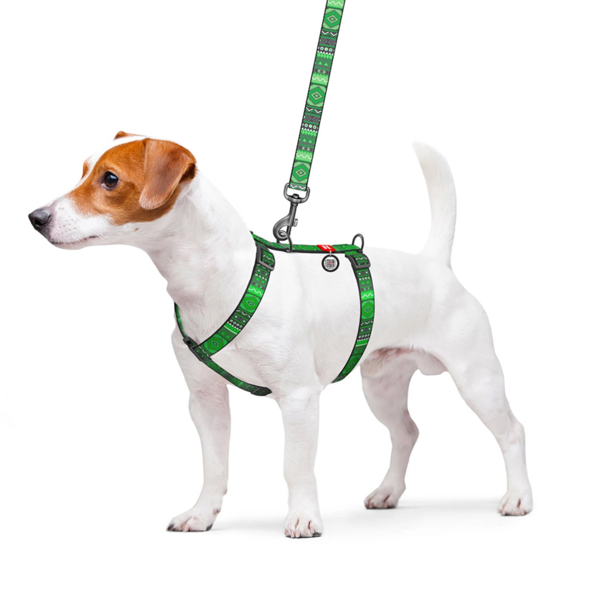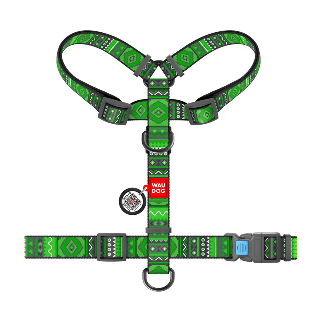 Шлея для собак анатомическая H-образная WAUDOG Nylon с QR-паспортом, рисунок "Этно зеленый", пластиковый фастекс, S, Ш 15 мм, A 30-40, B 30-50