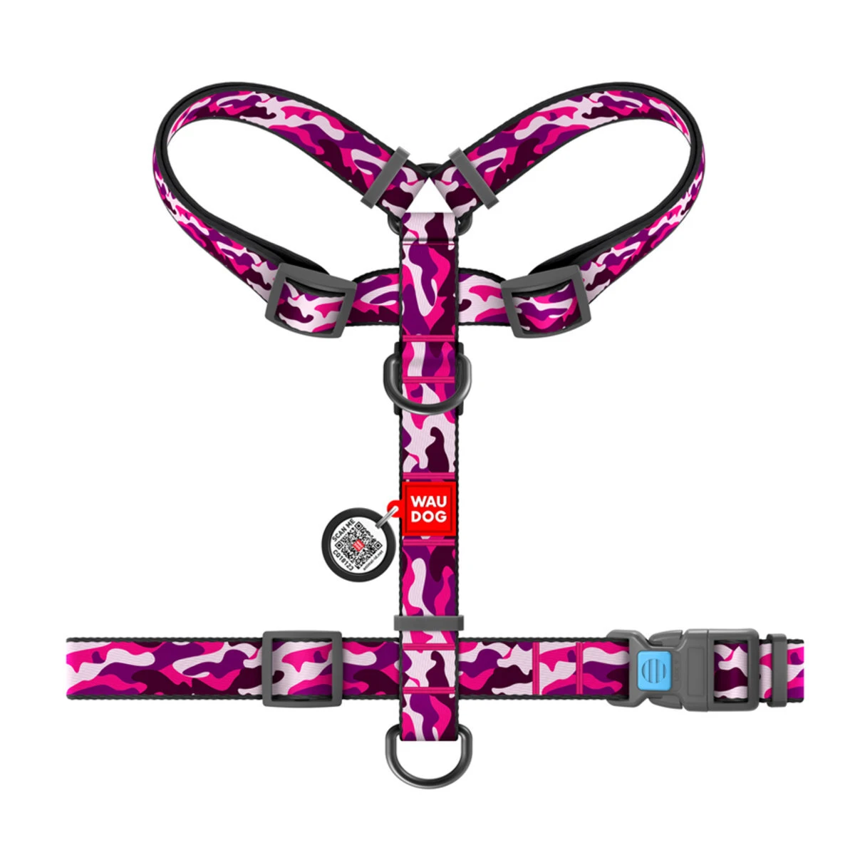 Шлея для собак анатомическая H-образная WAUDOG Nylon с QR-паспортом, рисунок "Розовый камо", пластиковый фастекс, L, Ш 25 мм, А 50-90, В 60-100