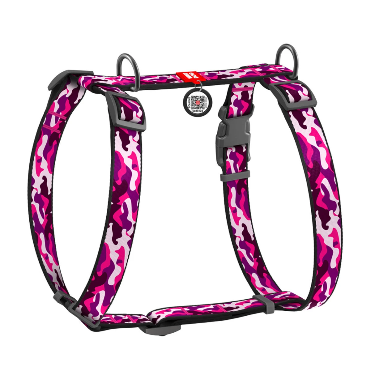 Шлея для собак анатомическая H-образная WAUDOG Nylon с QR-паспортом, рисунок "Розовый камо", пластиковый фастекс, М, Ш 20 мм, А 40-70, В 50-80