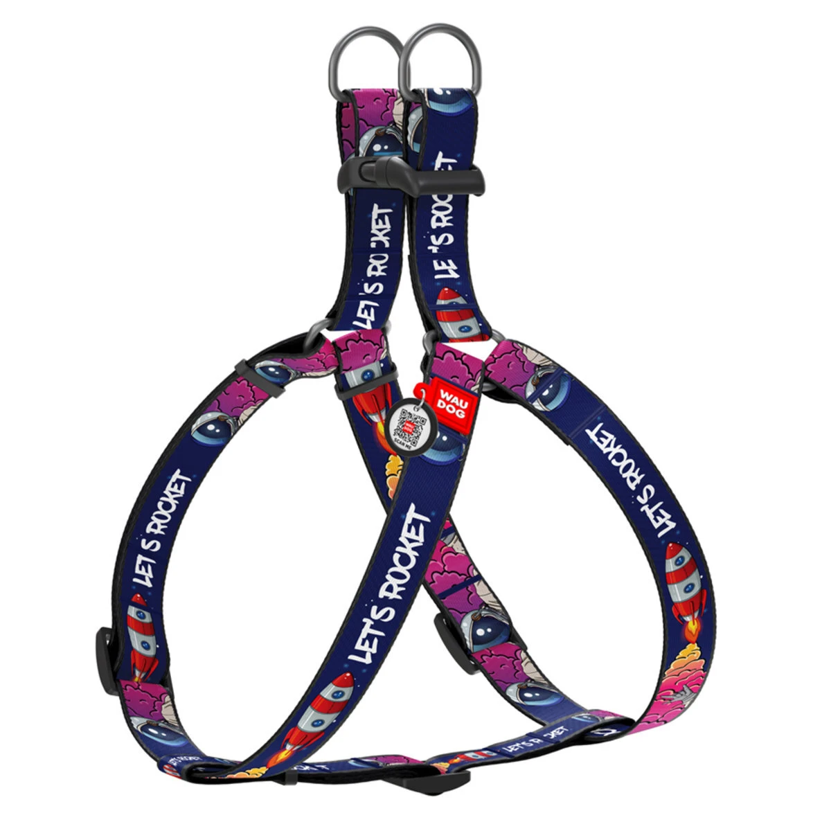 Шлея для собак нейлоновая WAUDOG Nylon c QR-паспортом, рисунок "Космос. Ракета", пластиковый фастекс, S, Ш 15 мм, Дл 40-55 см