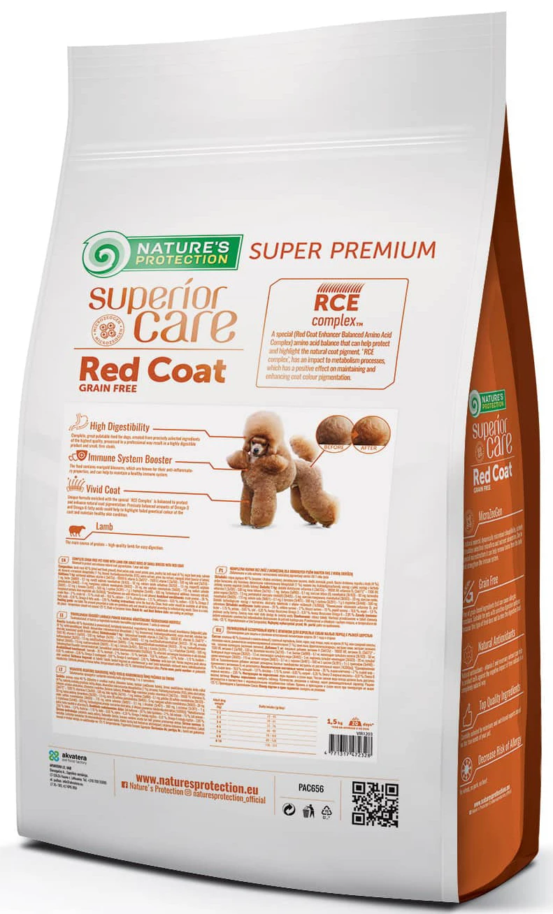Полноценный беззерновой корм с ягненком для взрослых собак малых пород с рыжей шерстью.