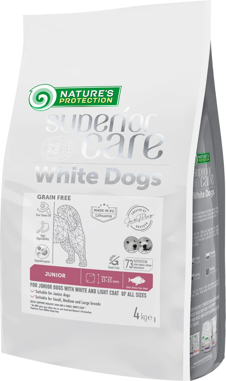 Хозяева белошерстных и светлошерстных собак нередко сталкиваются с такой проблемой, как потемнение шерсти в области глаз и на других частях тела домашнего любимца, таких как: бородка, лапки и т. д. Именно для решения данной проблемы при сотрудничестве с профессиональными заводчиками и экспертами в области питания домашних животных, а также с учетом передовых исследований и применением новейших технологий, была разработана специализированная линейка сухих кормов WHITE DOGS.