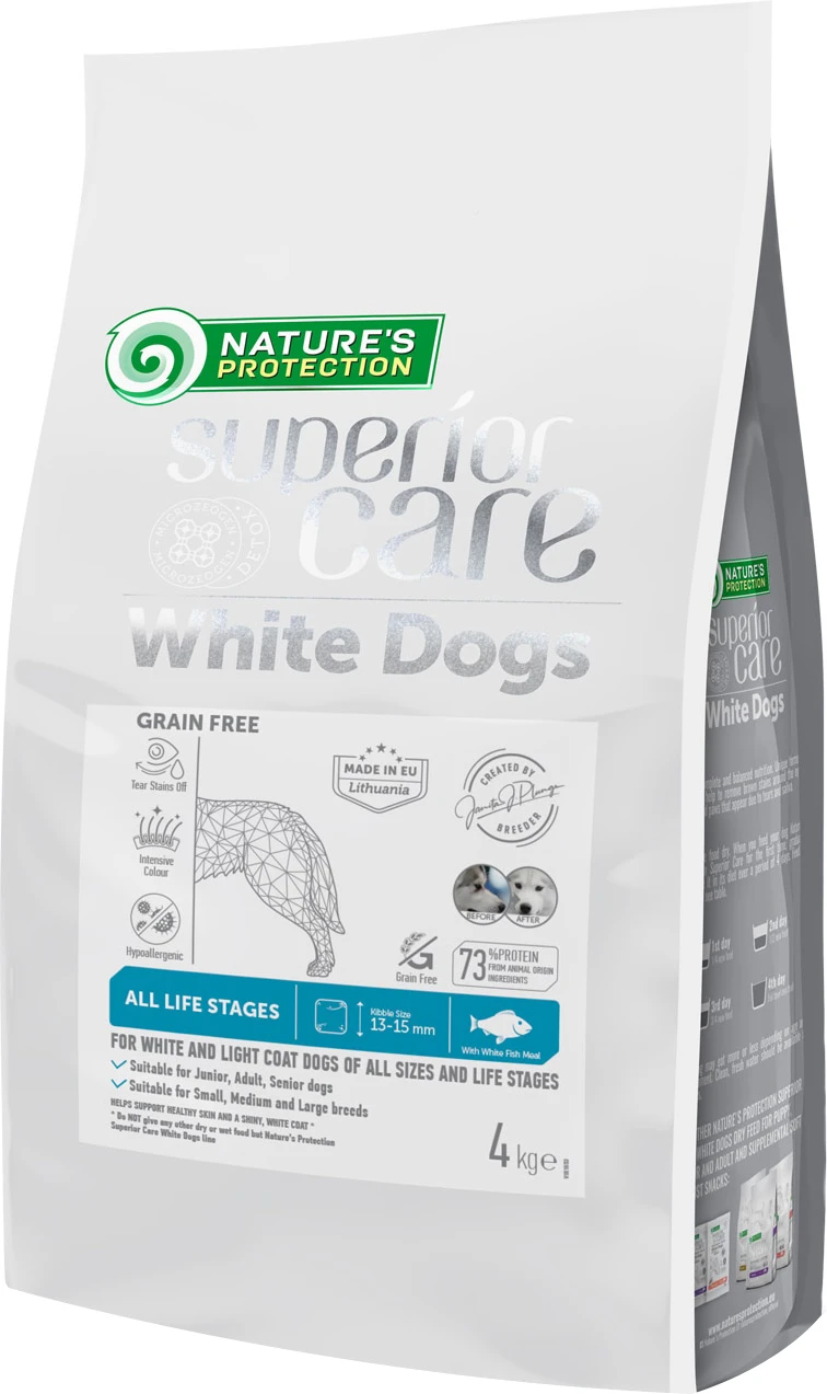 Основные характеристики: Доступные объемы: 4 кг и 10 кг. С белой рыбой. Для собак с белым и светлым окрасом шерсти.белая рыба 41 % (сушеный и измельченный), сушеный картофель, батат, горох, жир птицы, мука из криля (мин. 4 %), жом сахарной свеклы, лососевое масло, динамически микронизированный клиноптилолит (1 %), семя льнa, фруктоолигосахариды, юкка мохаве, зелёный чай, сушеная календула (источник лютеина).