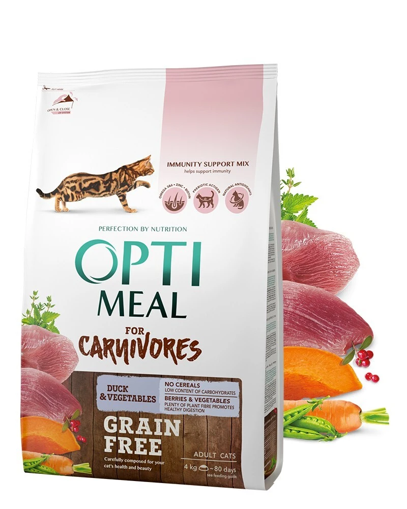 Беззерновой корм для взрослых кошек - УТКА и овощи- Без зерновых и злаковой клейковины (глютена). Поддерживает оптимальный вес кота и защищает пищеварительную систему от нагрузки - Снижает риск возникновения пищевой аллергии - Свежее мясо утки в виде фарша обеспечивает кота высококачественным легкоусвояемым протеином животного происхождения - Ягоды, травы и овощи в составе корма являются естественным источником витаминов и растительной клетчатки - Высокое содержание овощей предотвращает развитие сахарного диабета благодаря углеводам с низким гликемическим индексом - Содержит комплекс для укрепления иммунитета Immunity Support Mix - Омега-3 и 6, цинк, биотин помогают поддерживать кожу кота здоровой, а шерсть блестящей Содержит 72,65% протеинов животного происхождения - SUPER PREMIUM формула. Рацион изготавливают под контролем ветеринаров по технологии швейцарской компании Swiss Pet Nupition Group