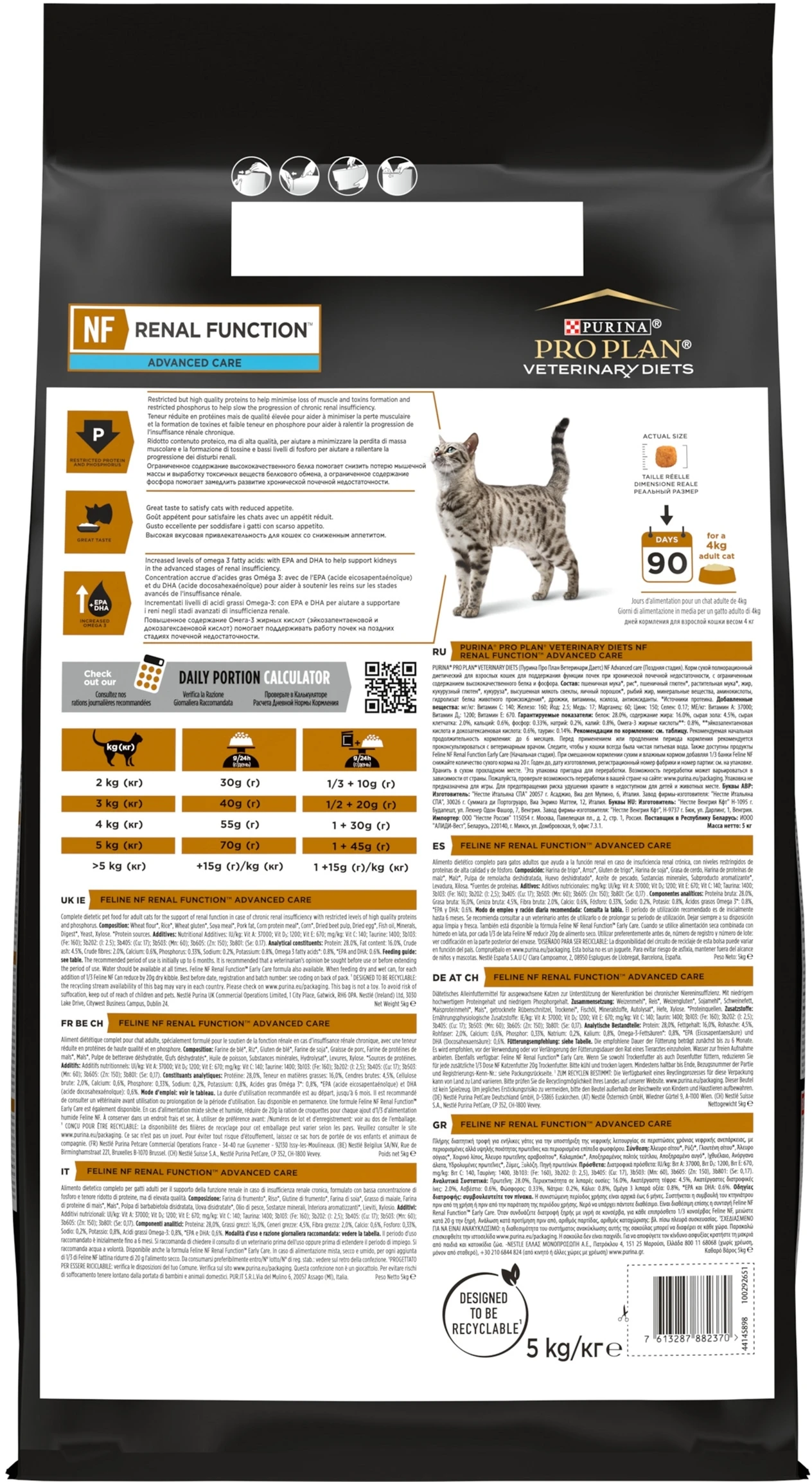 Purina Pro Plan Veterinary Diets NF Advanced Care (Ветеринарная Диета НФ Ренал Фанкшн Профессиональный уход) – сухой полнорационный диетический корм для взрослых кошек, для поддержания функции почек при хронической болезни почек. С ограниченным содержанием высококачественного белка и фосфора. Ограниченное содержание высококачественного белка в корме помогает снизить потерю мышечной массы и выработку токсичных веществ белкового обмена, а ограниченное содержание фосфора помогает замедлить развитие почечной недостаточности животного. Корм для кошек Pro Plan Veterinary Diets NF Advanced Care обладает высокой вкусовой привлекательностью для животных с пониженным аппетитом. Повышенное содержание Омега-3 жирных кислот (эйкозапентаеновой и докозагексаеновой кислот) помогает поддерживать работу почек на поздних стадиях почечной недостаточности.