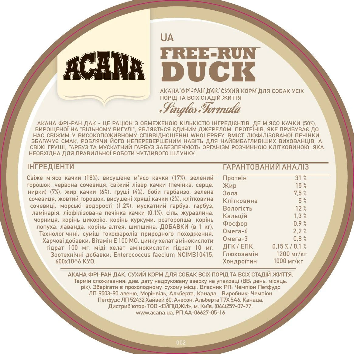 -, сырая утка (18%), дегидратированная утка (17%), цельный зеленый горошек, цельная красная чечевица, сырая печень утки (9%), жир из утки (6%), свежие груши (4%), цельный нут, цельная зеленая чечевица, цельный желтый горошек, гороховый крахмал, клетчатка чечевицы, водоросли (источник ЭПК и ДГК, 1,2%), свежая цельная мускатная тыква, свежая цельная тыква, сушеная ламинария, соль, сушеный корень цикория, цельная клюква, цельная черника, куркума, расторопша, корень лопуха, лаванда, корень алтея, шипов