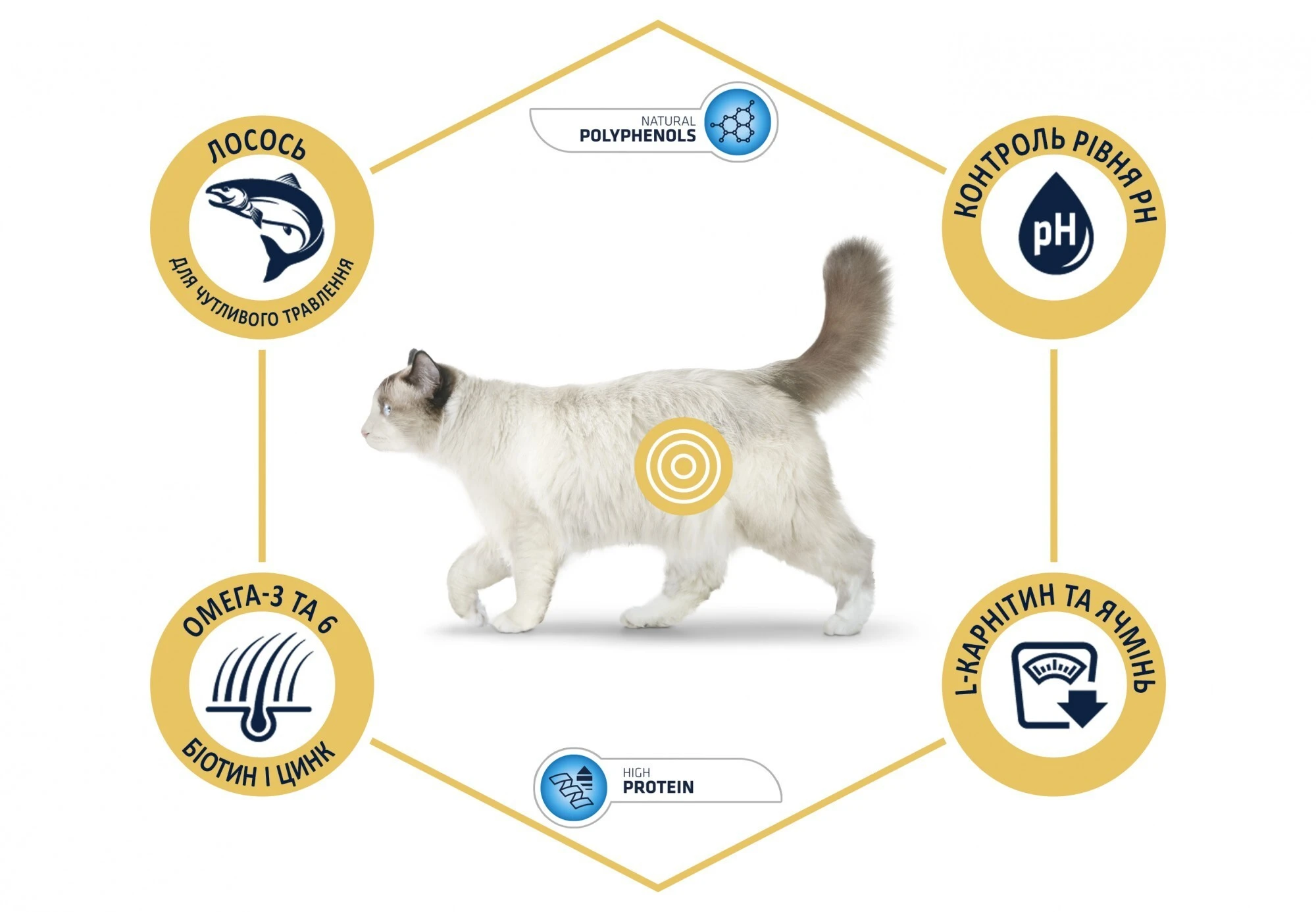 - Контроль веса: низкое содержание калорий и жиров и ячменные углеводы и L-карнитин, которые превращают жир в энергию, помогают снизить жировые запасы и предотвратить набор веса в стерилизованных кошек