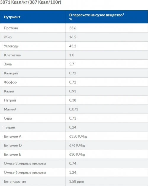 СРЕДНИЙ АНАЛИЗ: Протеин 31,7%, Жир 15,5%, Сырая клетчатка 0,95%, Сырая зола 5,3%, Кальций 0,68%, Фосфор 0,68%, Натрий 0,36%, Калий 0, 85%, Магний 0,07%, Хлориды 0,88%, Сера 0,67%, L-триптофан 0,34%, Витамин А 5768 МЕ, Витамин D3 614 МЕ, Витамин Е 600 мг/кг, Бета-каротин 1,5 мг/кг, витамин В6 25,3 мг/кг, цитрат калия 2 г/кг, гидролизат молочного протеина 1 г/кг.
