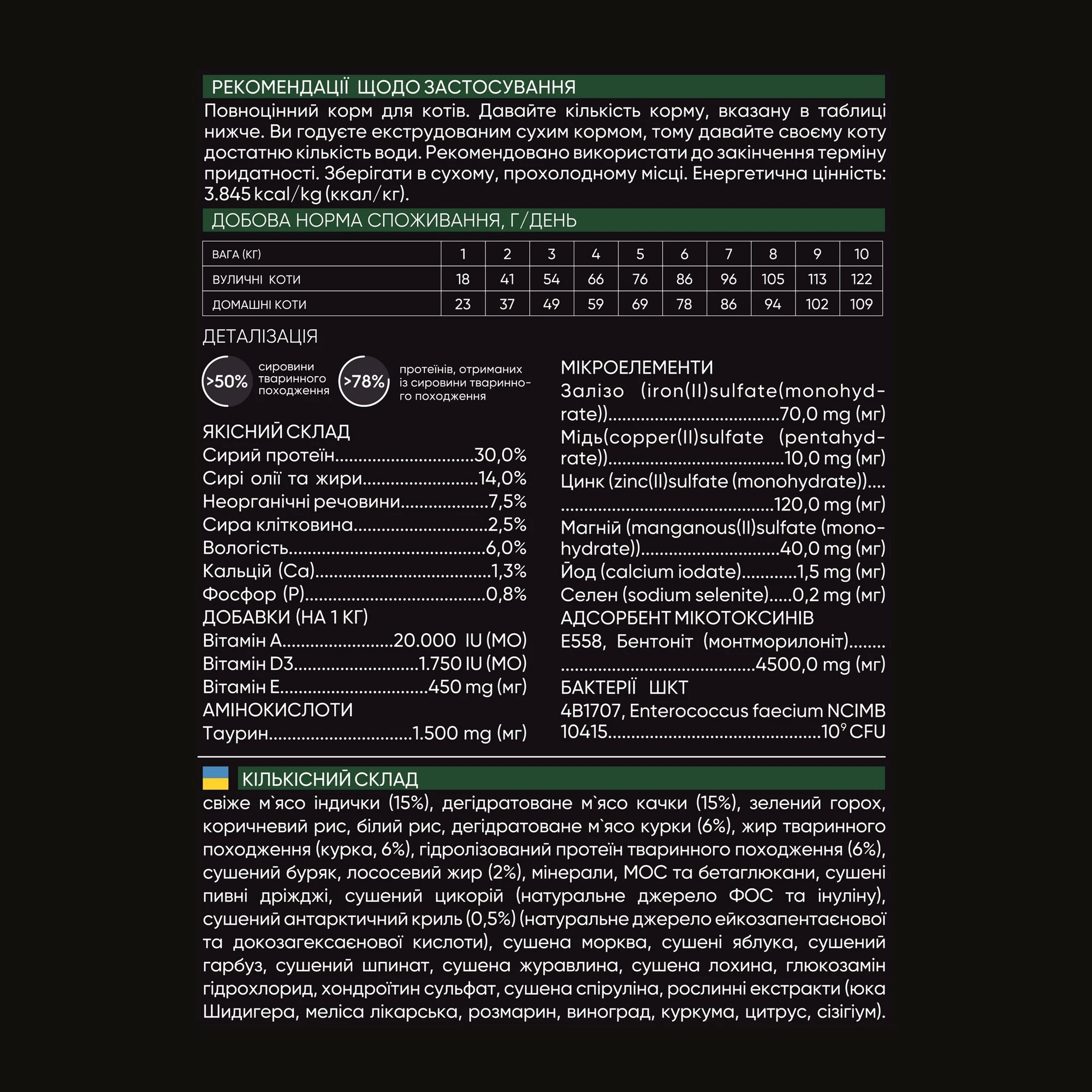 Состав: мясо индейки (15%), дегидратированное мясо утки (15%), зеленый горох, коричневый рис, белый рис, дегидратированное мясо курицы (6%), жир животного происхождения (курица, 6%), гидролизованный протеин животного происхождения (6%), сушеная свекла, лососевый жир (2%), минералы, МОС и бетаглюкан, сушеные пивные дрожжи, сушеный цикорий (натуральный источник ФОС и инулина), сушеный антарктический криль (0.5%) (натуральный источник эйкозапентаеновой и докозагексаеновой кислоты), сушеная морковь, сушеные яблоки, сушеная тыква, сушеный шпинат, сушеная клюква, сушеная голубика, глюкозамин гидрохлорид, хондроитин сульфат, сушеная спирулина, растительные экстракты (юкка Шидигера, мелисса лекарственная, розмарин, виноград, куркума, цитрус, сизигиум).